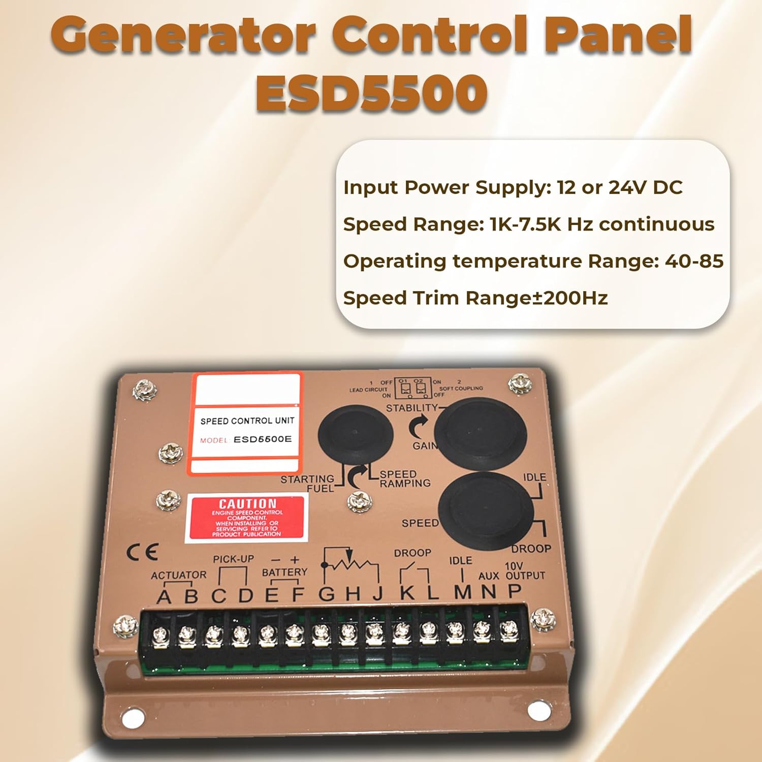 ESD5500E Electronic Engine Speed ControllerSpecification:Model: ESD5500EItem type: Electronic GovernorMaterial: IronPower supply voltage: DC 12V/24V(universal)Operating temperature Range: 40-85Relative humidity: 95Shock 20-100HZ 500mm/SecConnector:A-B: ActuatorC-D: Speed sensorE-F: BatteryG-J: Trimmer potentiometerG-M: Idle switchK-L: Speed controlCompatibility:ESD5500E engine speed controller replacement for GAC matched actuators (not replacement for ACB2000 electronic actuators)Package Includes:1 x ESD5500E Engine Speed Controller