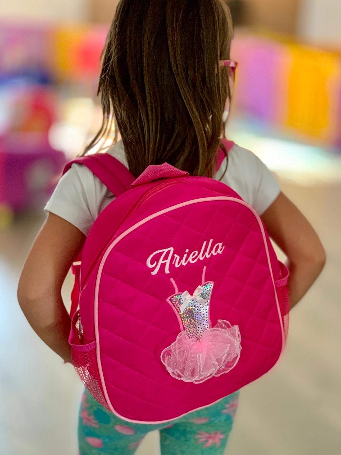 An adorable backpack bag with lots of style. This bag features 3D Ballerina tutu, bow, and sequins with a quilted outer and satin lined inner. Also has a small zipped pocket inside and two mesh pockets on the sides. They will love seeing their name on this very special bag, also great for gift giving!