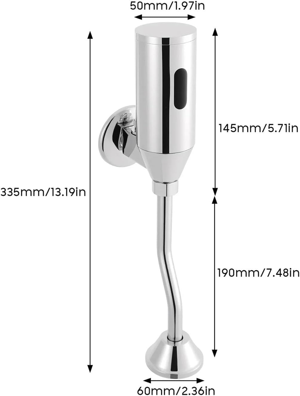 1. It can withstand frequent use in environments with high traffic such as public toilets, easy to adjust and easy to operate.2. It is strong and durable, and is widely used in public places such as hotels, schools and bathrooms.3. The surface of the flush valve is treated with polished chrome, making the flush valve smooth and beautiful in appearance.SpecificationColor: SilverProcess: ElectroplatedFlush Control Mode: Automatic InductionInstallation Method: Wall MountedPower Supply: 4 x AA BatteriesVoltage: DC6VTemperature: 0.1-45/32.18-113°FInduction Range(Adjustable): 55-65cm/21.65-25.59inchApplicable Water Pressure: 0.05Mpa~0.8MpaWater Inlet Diameter: G1/2''(DM15)Product Size(D*H): 6*33.5cm/2.36*13.19inchSensor Size(D*H): 5*14.5CM/1.97*5.71inHose Length: 19cm/7.48inDescription:Easy to Install: Complete accessories, and simple construction make it very easy to assemble, saving you timeSpace Saving: The wall-mounted design is not only space-saving but also suitable for a variety of transformation projectsEasy to Maintain: It has a built-in solenoid pulse valve and the water inlet has a filter, allowing you to clean it easily in a short timeSturdy and Durability: The item is electroplated process, making it waterproof, impact-resistant and sturdy, so it can remain practical and beautiful without frequent replacementConvenient and Hygienic: The entire flushing process is automatically controlled by sensors, so you can flush after urinating without touching any part of the flusher, which is convenient and hygienic and avoids bacterial cross-infection.Sensing Distance Adjustment: The sensing distance can be adjusted (21.65-25.59 inch) to meet a variety of needs according to the specific environment to achieve the purpose of promoting a level of public health.Package list:1pcs Automatic Sensor Urinal FlusherNote:Please allow the slight color difference caused by the shooting light and 1-3 cm error due to manual measurement