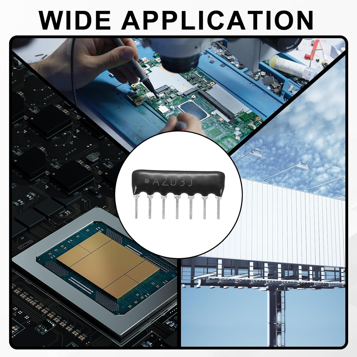 What is this?A thick-film resistor array is a combination of several resistors. One end of all resistors shares a common connection. Bus-type configuration is commonly used for pull-up, pull-down, or logic signal interrupt termination.What will I get?Model No.: A203JResistance: 20K OhmTolerance: ±5% (J)Rated Power: 1/8WMax. Working Voltage: 200VPin Type & Pin Pitch: SIP-7 & 2.54mmSize: 17.5 x 2.2 x 9mm (0.69" x 0.09" x 0.35")In the package of: 20Pack x 20K Ohm Resistor Network ArrayIs there any advantages of the product?High-DensityIntegrationand Reliable Design— 5 resistors on a single chip, supporting miniaturization and high-density integration, reducing the need for PCB traces.Provides stable electrical performance and high reliability, suitable for long-term use.Versatile And User-Friendly— Helps simplify circuit design and PCB layout, a practical tool for electronics enthusiasts and engineers.How to use it?The working principle of a resistor array is based on the series and parallel connection of resistors. Through internal connections, a resistor array can achieve different combinations of resistors to meet different resistance value requirements in a circuit.What should I notice?Before purchasing, please ensure that the size and specifications are suitable for your equipment.