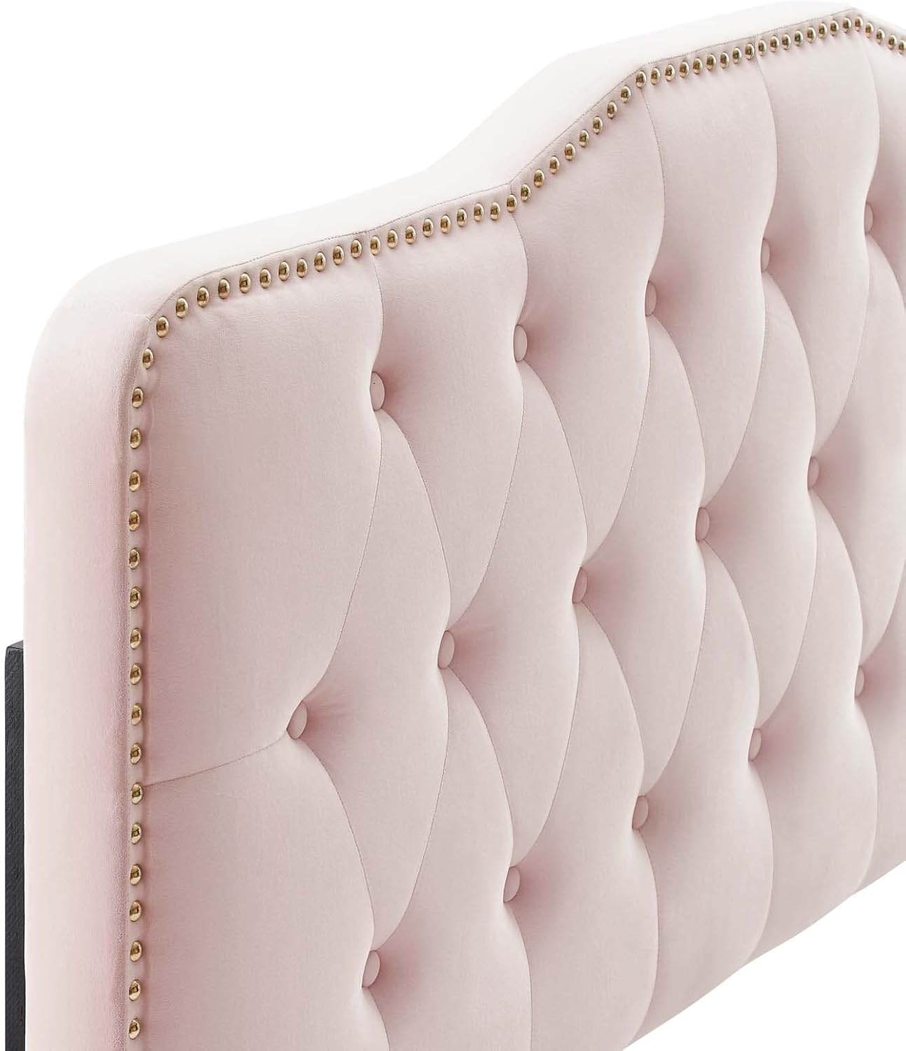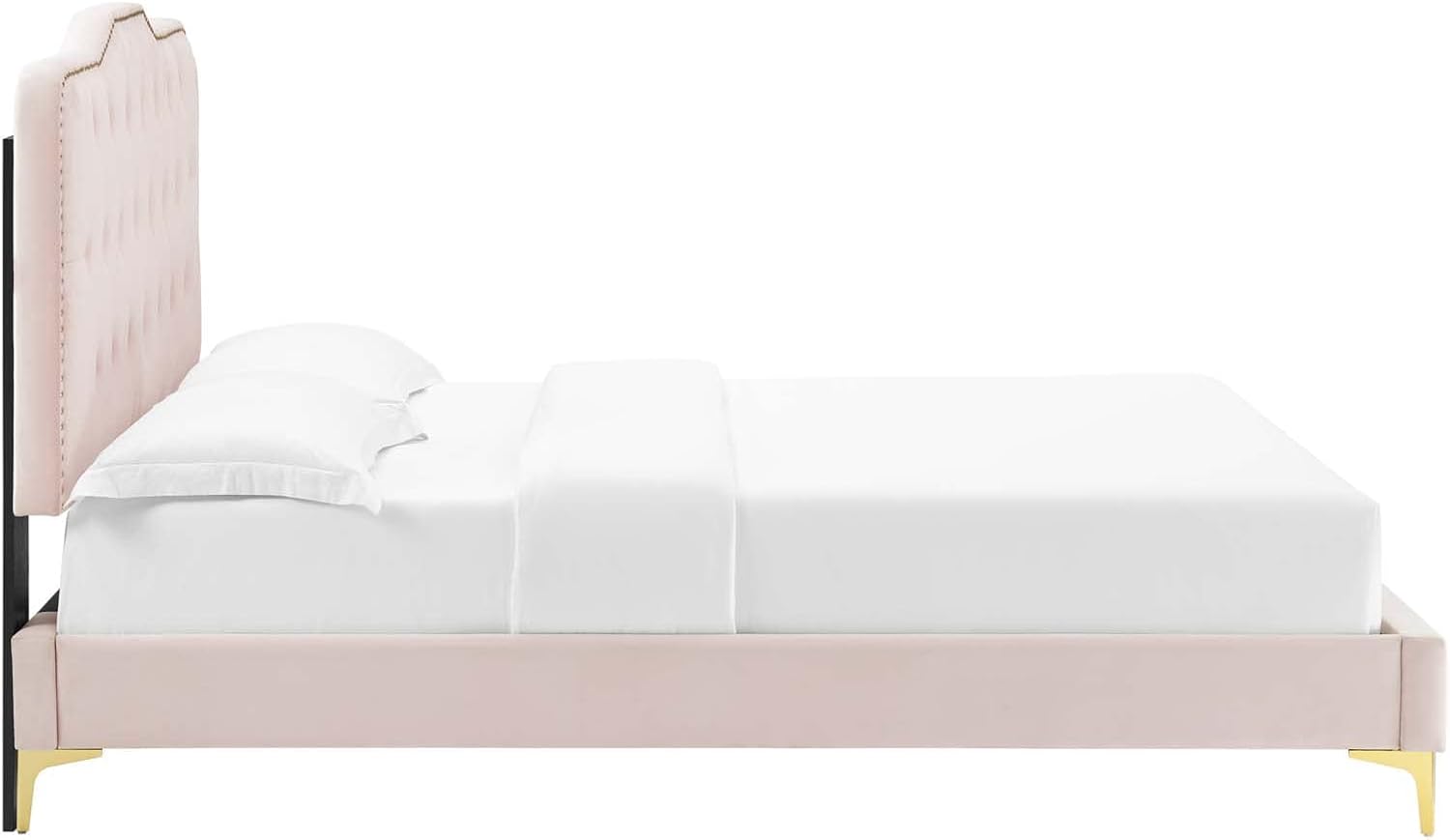 Refresh a kid's bedroom or guest bedroom with the glam deco style and vintage modernity of the Amber Performance Velvet Twin Platform Bed. Adorned with classic button tufting and framed with nailhead trim, the twin headboard of this platform bed features a charming silhouette. Covered in stain-resistant performance velvet, the padded headboard creates a supportive place to rest and relax while sitting up in bed. This upholstered bed frame is a sturdy mattress foundation for memory foam, innerspring, latex, and hybrid mattresses. Eliminating the need for a box spring, the MDF frame of this twin bed is complete with a wood slat support system crafted with poplar for lasting durability and support. This slatted bed frame rests on black wood legs with non-marking foot caps and includes a reinforced center beam with two support legs for enhanced stability. Assembly required. Weight Capacity: 800 lbs.