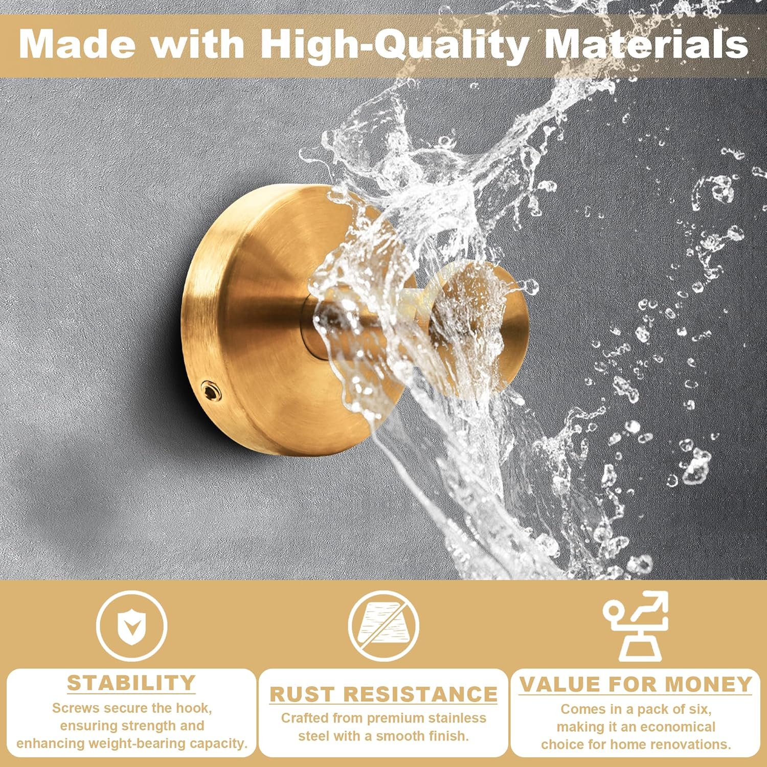 Introducing our premium collection of Wall Hooks Gold, designed to elevate your home decor with a touch of elegance. These Gold Bathroom Hooks are expertly crafted to meet the highest standards of quality and functionality, ensuring that your space not only looks stunning but also stays organized. Our Brass Towel Hooks are perfect for bathrooms, living rooms, or any area where you require a sophisticated and durable hanging solution. Crafted from premium stainless steel, these gold hooks for bathroom are built to withstand daily use, offering both strength and longevity. The smooth finish of each gold towel hook adds a polished look, seamlessly blending with any modern or classic decor. The 6-pack set provides ample options for hanging towels, robes, coats, or any decorative accessories, making them an ideal choice for those looking to enhance their space with gold hooks for wall. Each gold wall hook is equipped with a Hexagonal Allen Wrench, Expansion Rubber Plug, and Fastening Screw, ensuring easy and secure installation on a variety of surfaces including cement walls, marble, wood, brick, and tile. The removable design allows flexibility, letting you rearrange or remove the hooks without damaging your walls. Whether you need gold shower hooks or decorative towel hooks for bathrooms, these hooks provide a versatile solution.