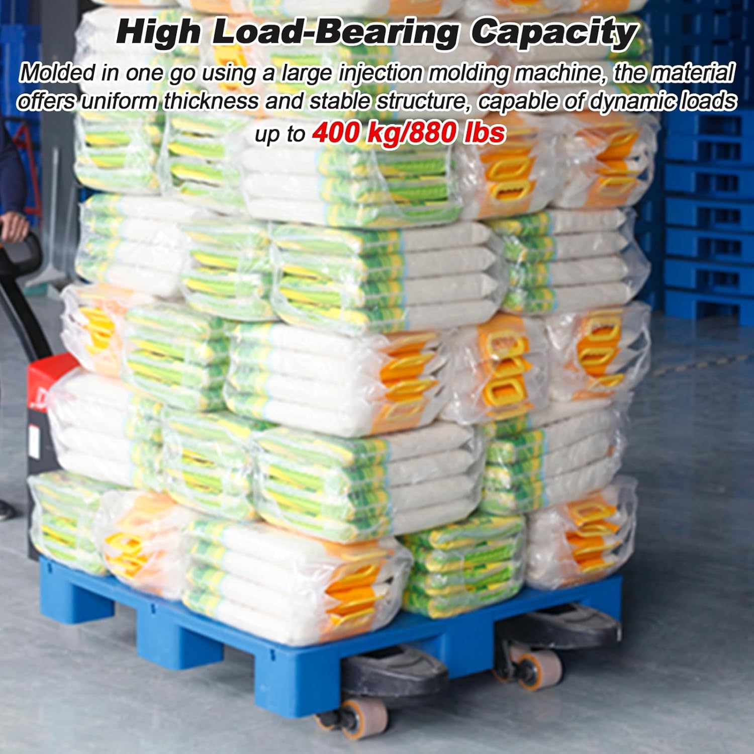 Ideal for transforming cluttered spaces into efficient storage areas, these plastic pallets offer industrial strength and versatile application potential. Its balanced size and excellent durability make it a smart choice for commercial and heavy-duty residential storage needs.Features:Reinforced ribs on the back provide stable load-bearing performance and resist deformation.Anti-slip particles increase friction, preventing items from slipping and tipping during transport.Usable in temperatures ranging from -22°F to 176°FMolded in a single step using a large-scale injection molding machine, it offers uniform thickness and a stable structure.Rounded corners provide impact resistance and prevent accidental collisions.Effectively insulates the floor from moisture and water accumulation.Specifications:Product Name: Plastic PalletColor: BlueMaterial: High-Density Polyethylene (HDPE)Dynamic Load Capacity: 880 lbsStatic Load Capacity: 1763 lbsDimensions: 31*24*6 inTemperature Range: -22°F to 176°FCompatible with 550 forkliftsPackaging Contents:1 plastic pallet