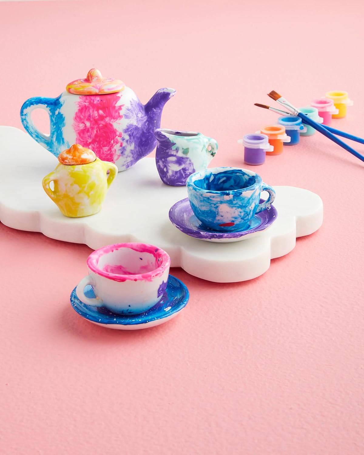 • Decorate your own tea set! Ceramic teapot, tea cups, saucers, sugar bowl and cream pitcher comes with set of paints and two paintbrushes