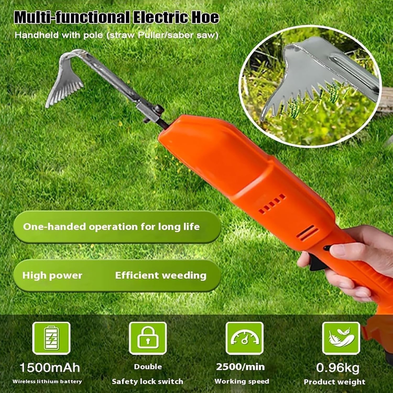 ❉Cultivator Hoe, Electric Weeder with Rechargeable Lithium Battery & Telescopic PoleElectric Digging Hoe Hand, 2-in-1 Gardening Tools & Rakefor Loosening Soil and Weeding❉Specifications:Name: Electric Cultivator HoeCharging Time: Approximately 3.5 HoursBattery Capacity: 2 x 1500mAhSingle Battery Run Time: 120 MinutesInternal Material of the Body: Powder MetallurgyWorking stroke: 30cmWorking Speed: 2500/minCasing Material: ABS/ PA+30GFSize: 44 x 10 x 7 cmWeight: 1.2kg❉Package List:1 x Electric Weeder2xBattery1 x Charger1 x telescopic pole1x Manual❉Note:1. Due to different monitors and lighting effects, the actual color of the item may differ slightly from the color shown in the picture.2. Please allow 1-2cm deviation due to manual measurement.My dear customer friends, we are committed to becoming one of Amazon's best-selling products, providing you with high-quality products and services. We wish you a pleasant shopping experience!After sales service: Thank you very much for purchasing our product. If you have any questions after receiving the product, we hope you can contact us and we will do our best to solve them for you.