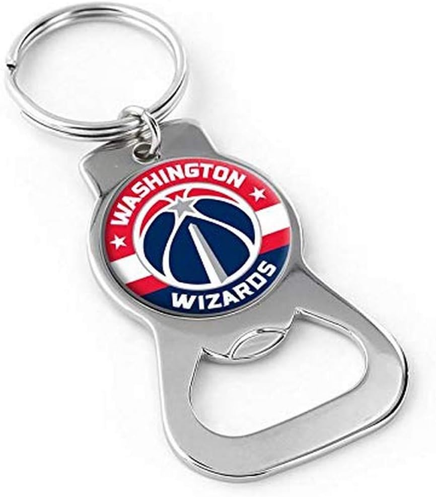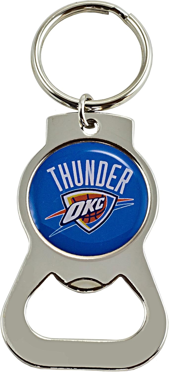 Show off your team pride with this NBA Bottle Opener Key Ring by Aminco. Each bottle opener key chain measures approximately 3.5-inches in length. It is printed with team colored graphics with acrylic dome overlay, organize your keys or open up your favorite beverage with ease. Perfect for gift giving!