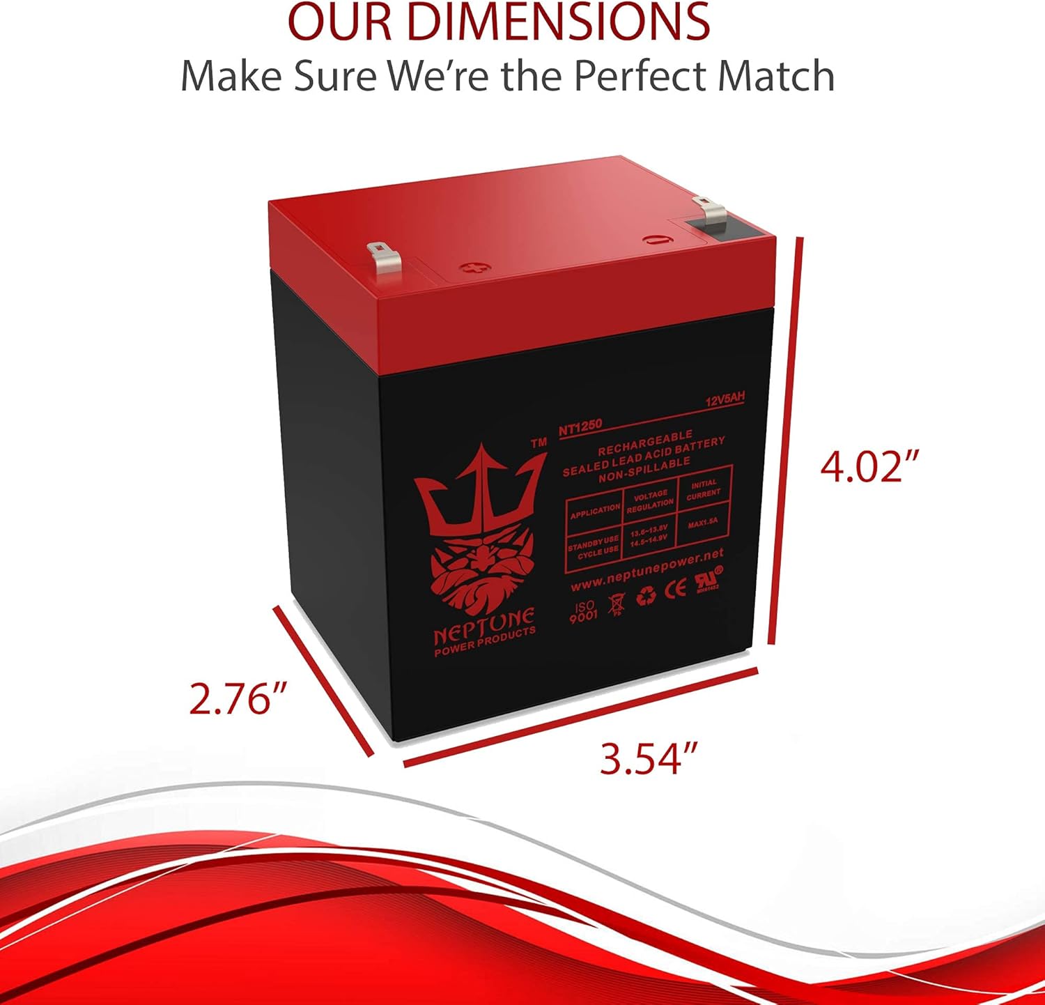Neptune Power Replacement Batteries meet and even exceed manufacturers specifications, Superior Design, High Quality, long lasting working life 3-5 Floating time range, High Quality ABS material Fire Resistant, The Latest Technology grid design and paste formulation, AGM high standard separators.Every Battery shipment is tested to Guarantee Hi- Performance & Longevity. Our Batteries Feature high discharge design, wide operating temperature range, and long expected service life.Neptune NT1250 12Volts 5 Amp replacement battery feature Valve-Regulated Lead Acid (VRLA) SLA Sealed Lead Acid Battery Technology, making them safe to operate in any position, near people and sensitive equipment.Manufactured under Japanese Quality standard, Environment Certificated Plant and facilities with:ISO 9001 for Quality Management Systems.ISO 14001 Environment Management System (EMS).Health and 14001 Safety Environment Standards certification.Under UL (Underwriters Laboratories) certifying Quality and manufacturing processes.Install your new NT-1250 Batteries in your device using the same original configurations and existing cables and connectors. Please check your battery for dimensions and Terminals prior to ordering as manufacturers may change requirements without notice.Beware Of SLA Batteries Without UL, UR, CE & ISO Symbols To Guarantee Quality & Genuine Specification Certifications. All Neptune batteries Are Manufactured In our Certified ISO Factories To Our Specifications.