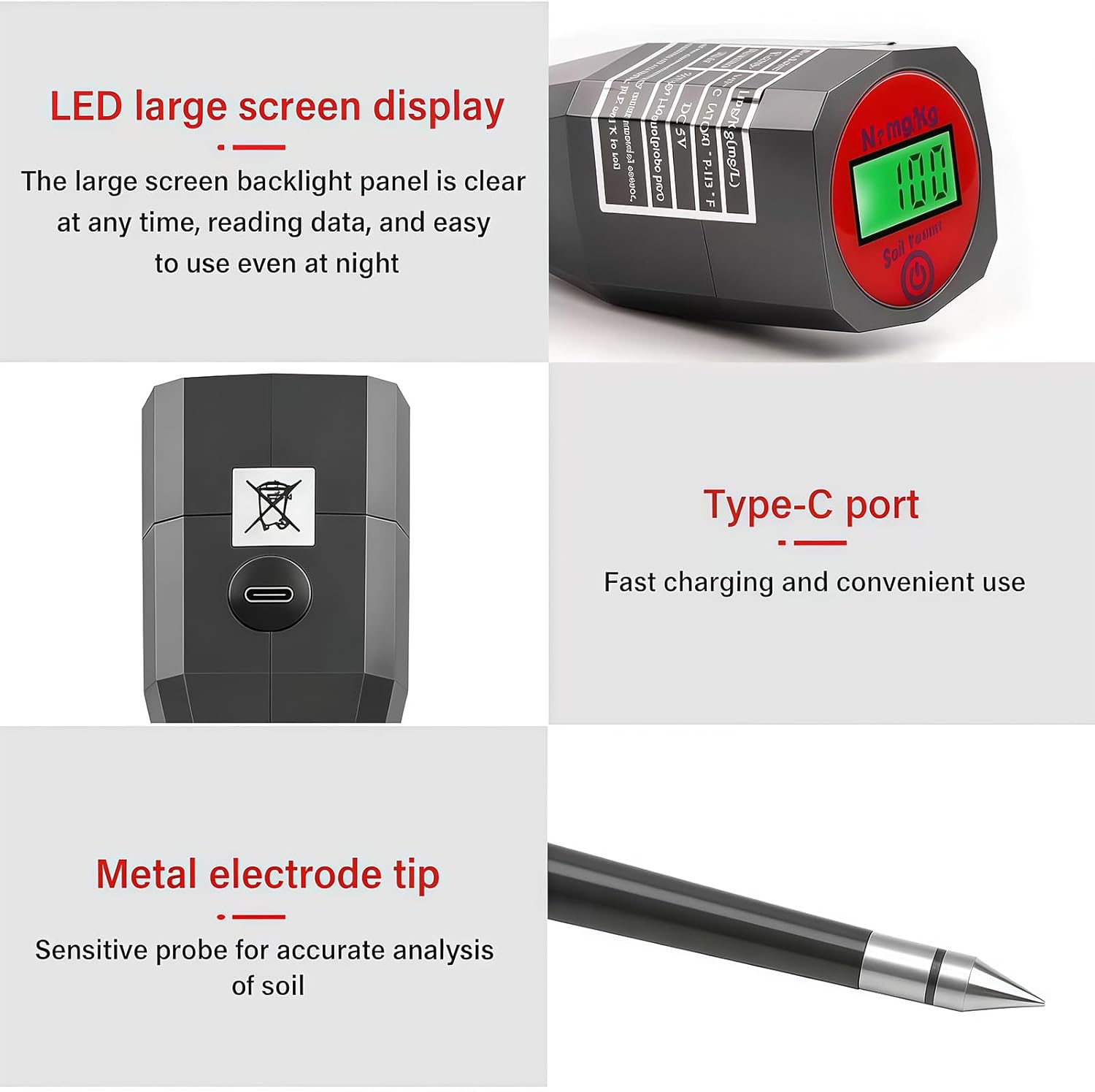 Features: This USB rechargeable soil tester accurately measures potassium levels with an error margin of less than ±5%, enabling users to optimize fertilization strategies and boosting crop yields efficiently. Featuring a ABS body and a USB rechargeable battery that provides up to 8hours of continuous use after a 1hour charging, this portable soil analyzers quick results within 10seconds through simple button operate. Designed for gardening enthusiasts, professional farmers, beginners, this soil nutrient detector reduces learning curves with its user friendly interfaces, making it accessible for all skill levels in agricultural setting. Ideal for home gardening, small farms, outdoor activity, and travel, this portable soil analyzers maintains high sensitivity across various soil types, ensuring reliability in environments. With its built in high sensitivity sensors, this soil tester delivers consistent accuracy for scientific research and agricultural management, providing essential data to enhances soil health and productivity. Specifications: Component: ABS Size:Approx.250x47x47mm/9.84x1.85x1.85inch 3Option Type Measuring ranges:0-1999mg/kg Battery capacity:500mAh Type C Charging Port; Charging time:1hour; Usage scenarios: home gardening,agricultural production,school experiments; Note: Please allow 1-3cm errors due to manual measurement. Due to the differences between different monitors, the picture may not reflect the actual item color. Package includes: 1pc Soil Tester