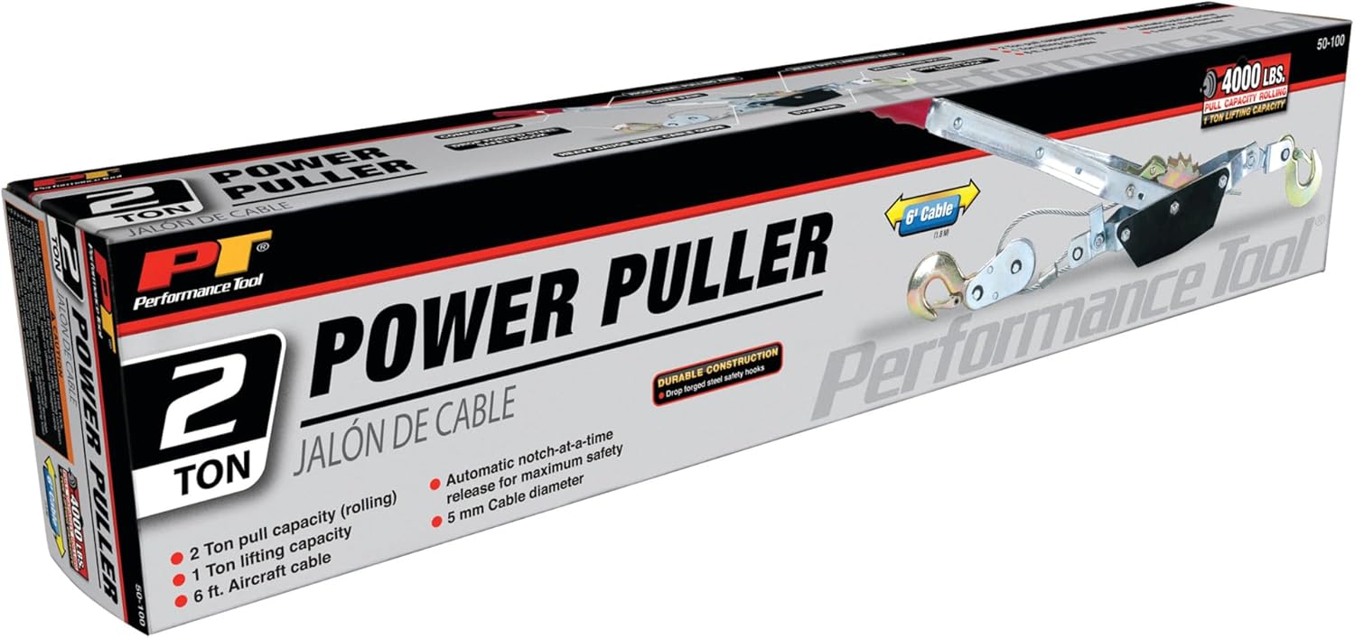 The Performance Tool 50-100 2 Ton Cable Puller is the ultimate tool for all your heavy-duty pulling and lifting needs. With a 2 ton pull capacity (rolling) and a 1 ton lifting capacity, it can handle even the toughest jobs with ease. The drop forged steel safety hooks ensure maximum safety and durability, while the automatic notch-at-a-time release feature allows for controlled load release, reducing the risk of injury or damage to your load. The cable length of 6 feet and diameter of 5mm, along with hooks on both ends, provide versatility in attaching to your load and anchor point. The double laminated gear/pawl and 2.8mm handle thickness and 2.6mm frame thickness make this cable puller a reliable and durable tool for all your pulling and lifting needs.