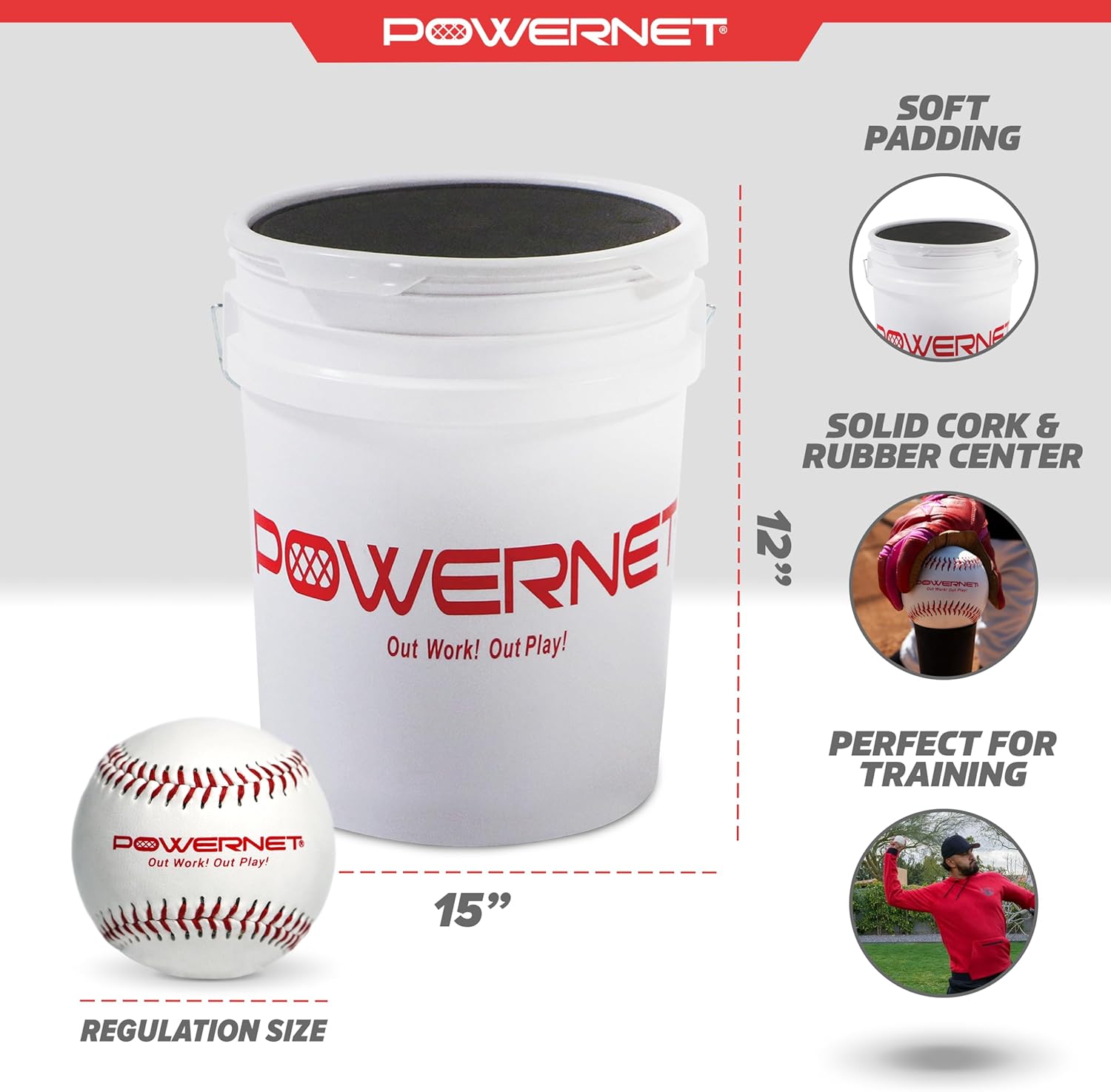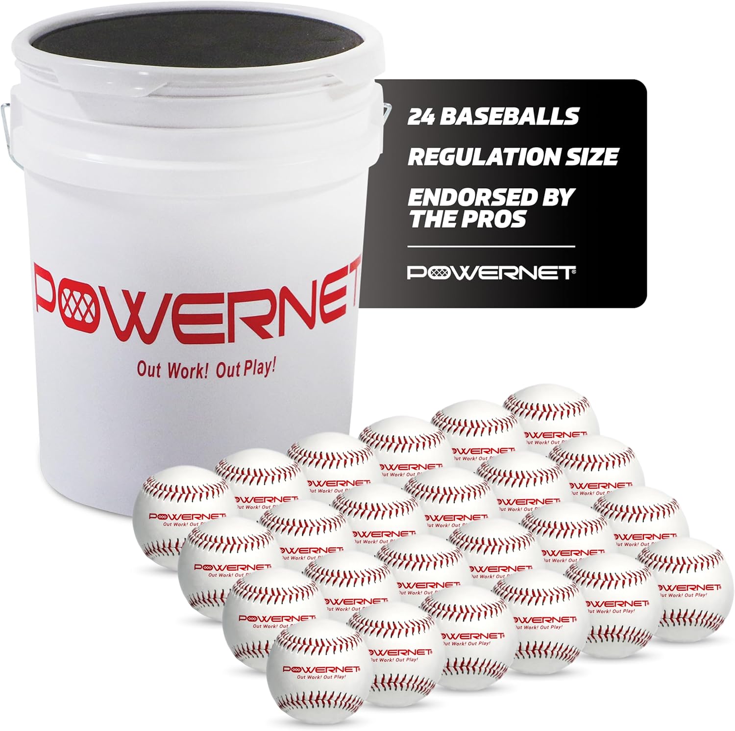 PowerNet's 7x7 Ft Softball & Baseball Practice Net is paired with an adjustable baseball tee for improved batting, hitting and fielding practice. The 7x7 baseball net is durable and perfect for tee-ball practice, infield practice, soft-toss, and softball or baseball pitching practice. The batting tee is height adjustable making it great for team training. It's easy to set up and only seconds to put away. Use with both baseballs or softballs. PowerNet Recreation Grade Baseballs are regulation size and weight baseballs. Ideal for warm-ups or practice, they offer the feel of regulation baseballs when hit, caught, or thrown. Made with a durable cork core, synthetic leather cover, and raised red stitching, they're highly visible on the field. The set includes an easy-to-transport bucket with a padded lid that doubles as a seat, perfect for solo or team training sessions. Includes 24 practice baseballs.