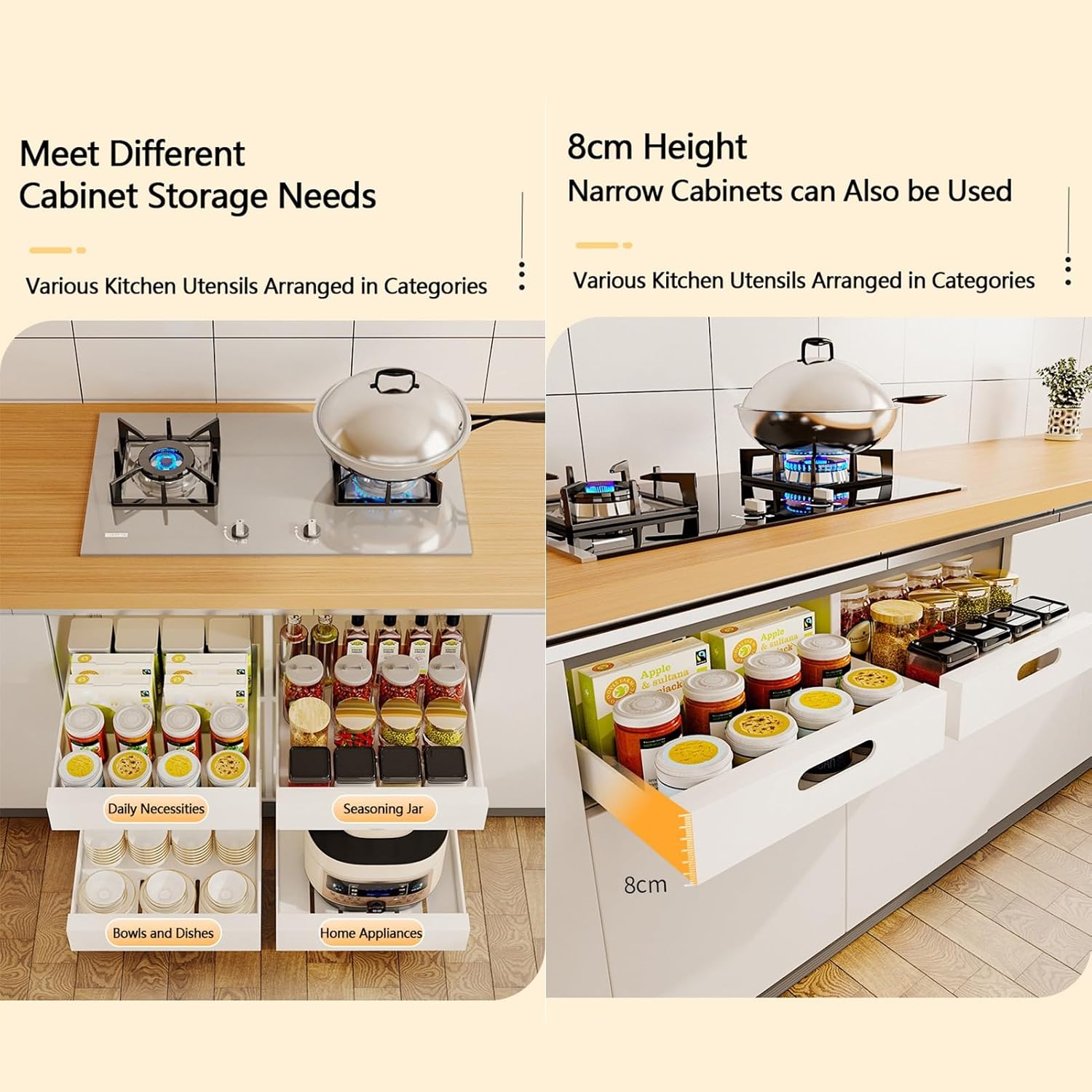 Spice Rack System Lift Upper Cabinet:Smooth-running drawer with slide-out mechanism Our pull-out closet organizer slides smoothly and makes no unpleasant noise Sliding rail design The steel ball guide effectively reduces friction, making the use smoother and less labor-intensive Easy access The slide-out rod is more convenient to take out. Press the bottom and move towards the center to open the pull-out drawer. Description: Name: Pull-out drawers. Style: Modern and minimalist Function: Multi-purpose, movable, no installation required Material: stainless steel. Storage shelf classification: inside the cabinet. Product dimensions: 43*25*6cm, 43*30*6cm, 43*35*6cm, 43*40*6cm Easy installation Step 1: Remove the white protective film from the adhesive. Step 2: Insert the drawer slide into the cabinet. Step 3: Put the slide in the correct position and press it down. Package contents: 1 x telescopic drawer