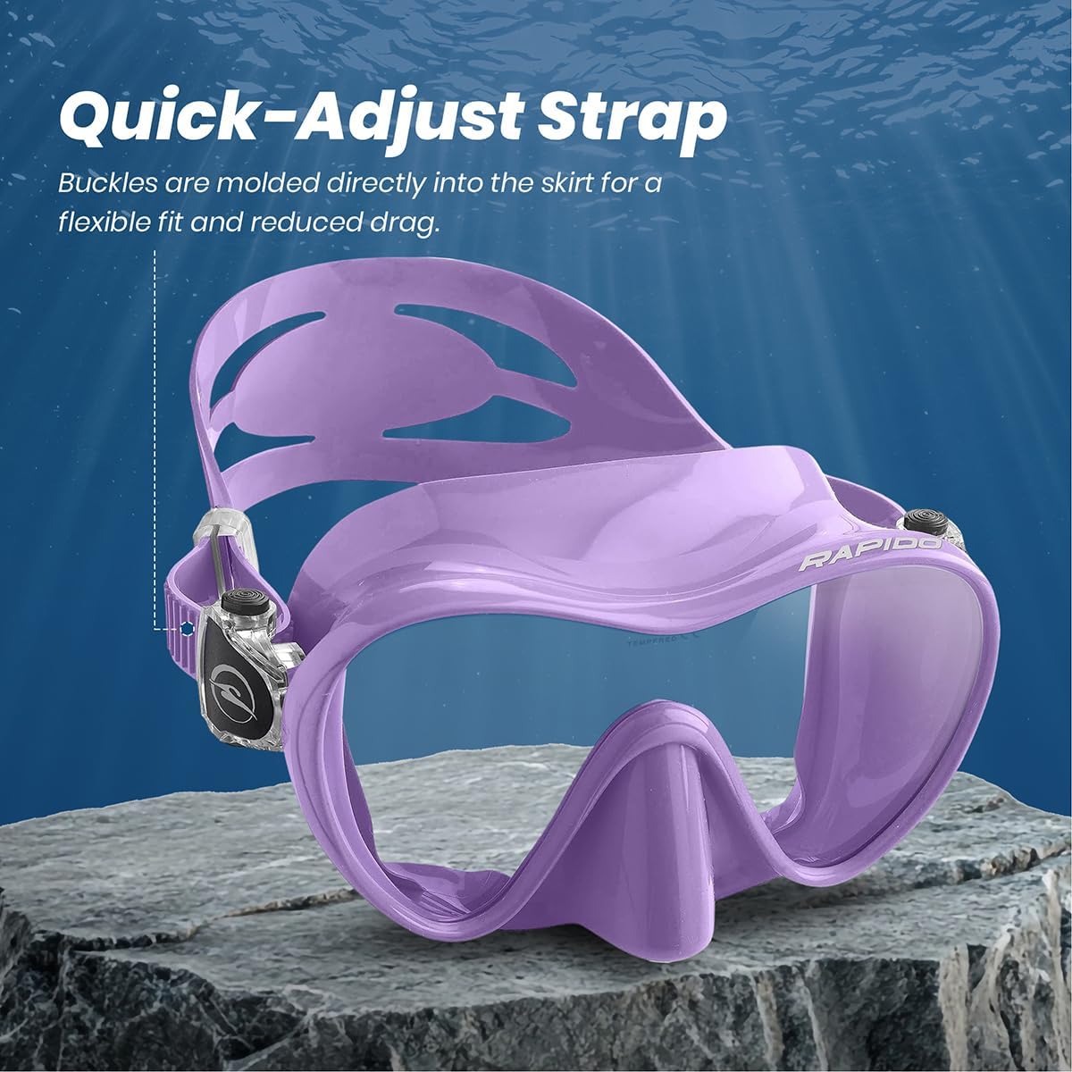 Lightweight Comfort & Crystal-Clear VisibilityThe Rapido Active Frameless Single Lens Mask from the Rapido Boutique Collection delivers premium comfort and clarity for divers and snorkelers. Engineered with a frameless dive mask design and a single lens scuba mask, it offers a wide 180 Degree field of view with minimal distortion. The tempered glass lens is anti-fog treated to maintain crystal-clear vision, making it an ideal freediving mask or scuba diving mask for professionals and hobbyists alike.Flexible Fit for Any AdventureBuilt with hypoallergenic silicone, the silicone dive mask skirt offers a secure and leak-free seal, while the low volume dive mask structure makes it easy to clear and perfect for spearfishing or snorkeling. Its quick-adjust buckle system ensures a customized fit for various face shapes. Whether you're exploring coral reefs or deep-sea diving, this professional diving mask is travel-ready, lightweight, and durable-crafted for maximum performance and comfort.