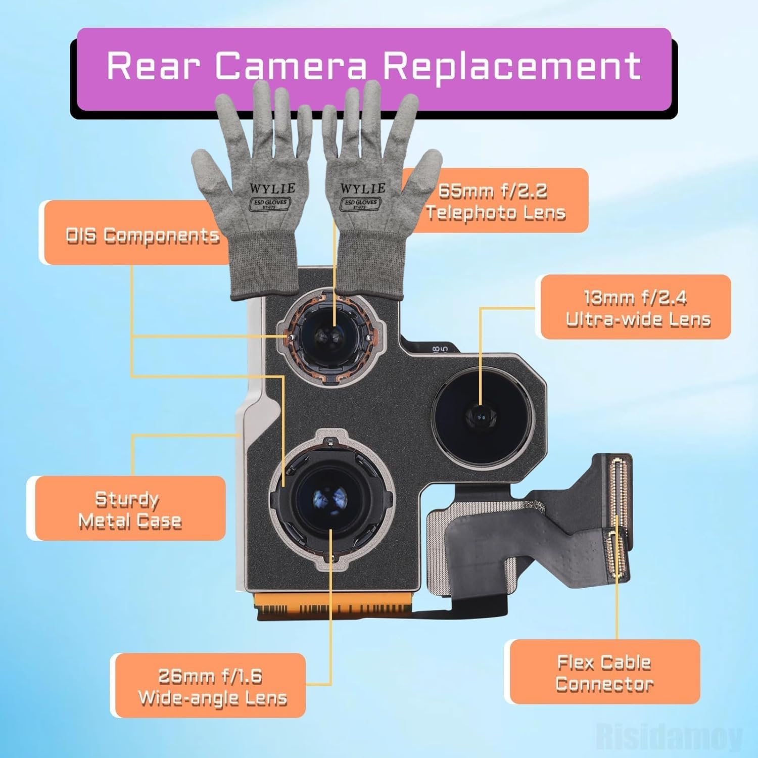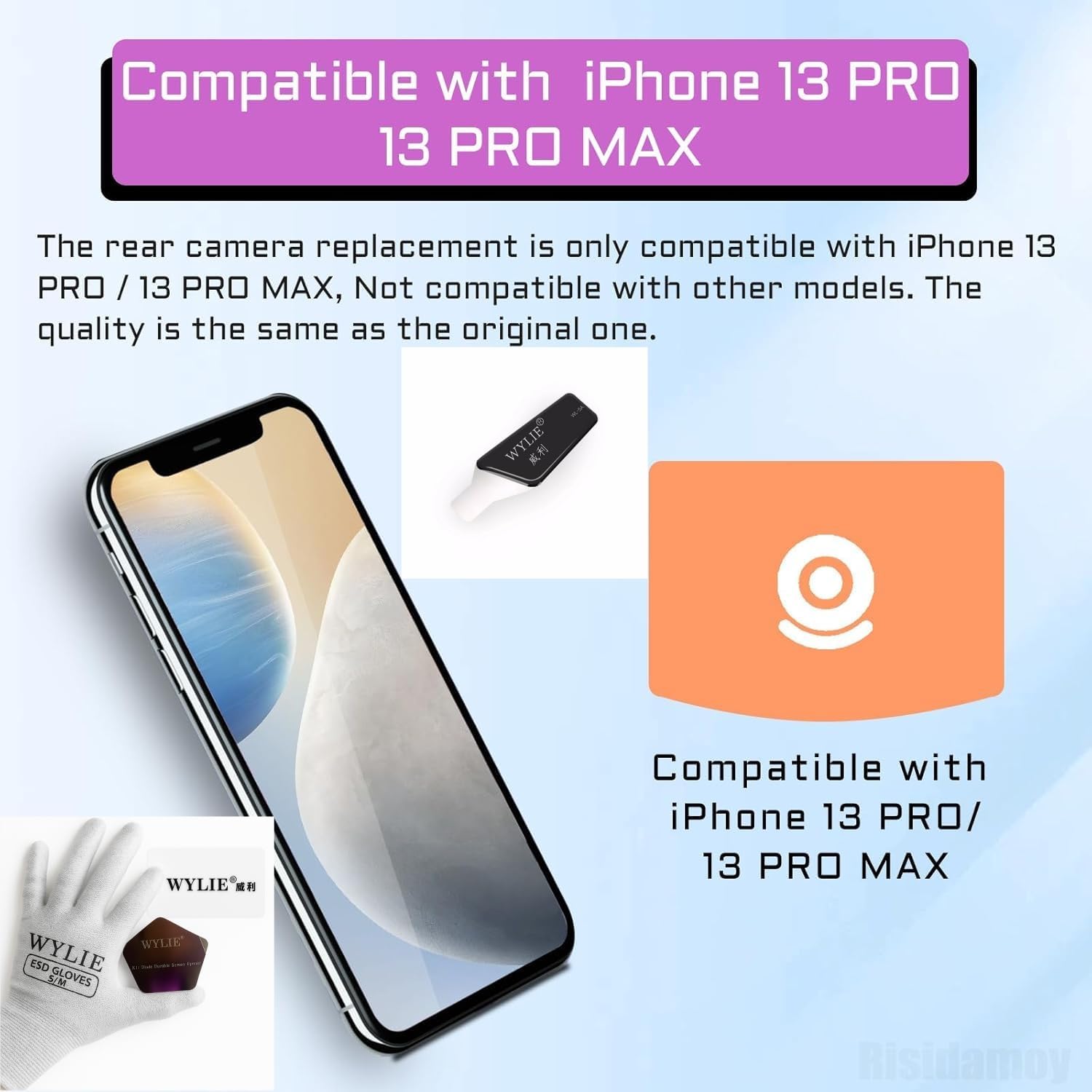 Rear Camera Replacement for iPhone 13 Pro iPhone 13 Pro Max 12MP OEM Back Camera No Pop-up Window with Ultra Wide Telephoto Lens HDR Photos 4K 60fps Video WYLIE Professional Repair Tools 5 Pack➤Product Description:🍀 ✔✿ - Upgrade your iPhone 13 Pro or 13 Pro Max with this premium rear camera replacement module;🍀 ✔✿ - This OEM-quality camera system features three professional-grade lenses: a 13mm f/2.4 ultra-wide lens for sweeping landscapes, a 26mm f/1.6 wide-angle lens for everyday shots, and a 65mm f/2.2 telephoto lens for detailed close-ups;🍀 ✔✿ - Housed in a sturdy metal case with precise flex cable connectors, this camera module delivers exceptional performance with 12MP resolution, HDR photo capability, and impressive 4K video recording at 60 fps;🍀 ✔✿ - The camera assembly is specifically designed for iPhone 13 Pro and Pro Max models (A2483, A2636, A2639, A2640, A2638), ensuring perfect compatibility and seamless integration. Installation should be performed with the included WYLIE ESD gloves to protect sensitive components;🍀 ✔✿ - This replacement module maintains all the advanced features of your original camera, including Night mode, Portrait mode, and ProRAW support, making it the ideal choice for restoring your iPhone's professional-grade photography capabilities,It is not recommended to do it yourself. Please refer to the professional instructions for replacement!📦➤Package Included:✿- 1x Pack of Rear Camera Replacement for iPhone 13 Pro iPhone 13 Pro Max 12MP OEM Back Camera with Ultra Wide Telephoto Lens HDR Photos 4K 60fps Video;✿- 1x PCS of WYLIE name card PVC fine frosted plastic material removing screen functional card;✿- 1x PCS of WYLIE WL-5A Solder paste scraper dismantling machine piece non destructive tin scraping slice;✿- 1x Pair of WYLIE ESD BGA repaire soldering working antiskid new environmental protection carbon fiber gloves;✿- 1x PCS of WYLIE K1 blade durable screen opener with 5 different depth corners tear down and flake opening pry tool for iPhone for Android Huawei Oppo iPad Macbook screen tool.
