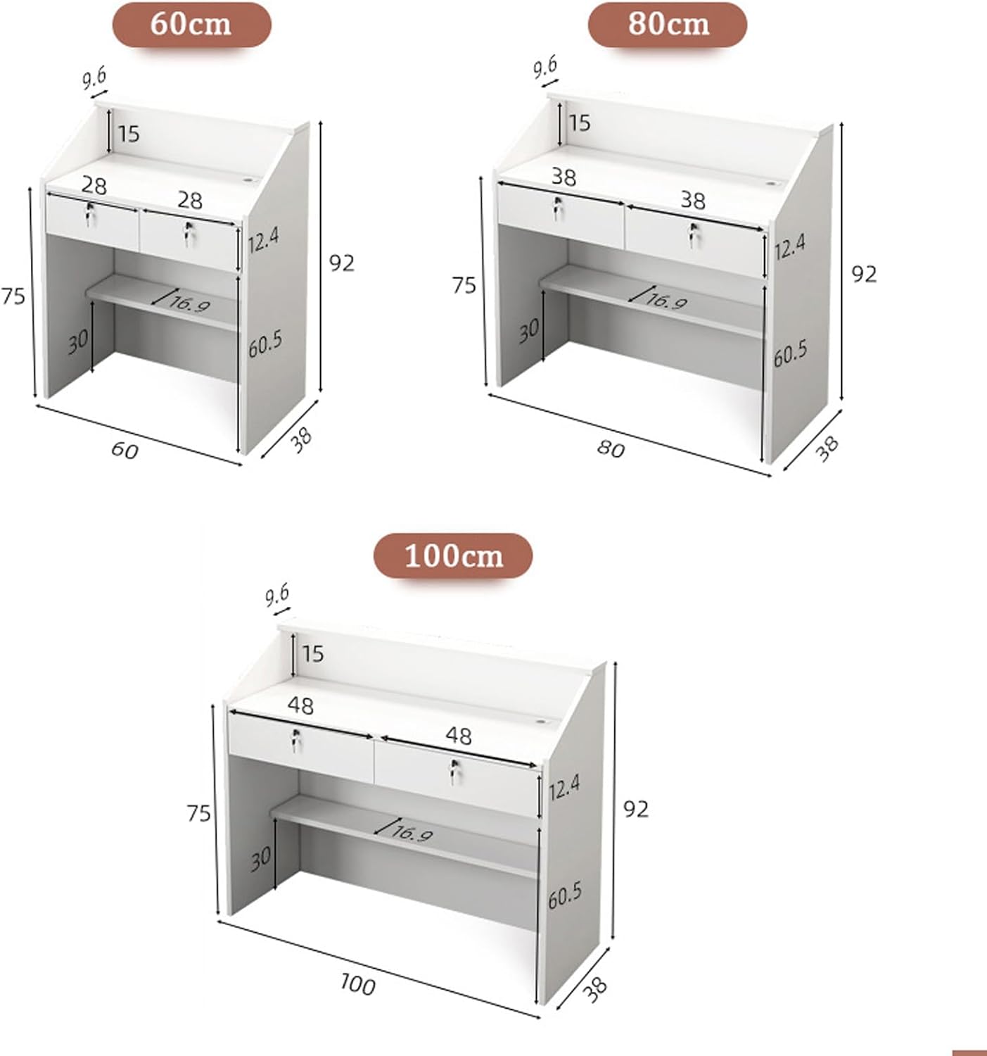 - Name: Reception Desk/Reception Table Counter - Size: 60/80/100*38*92 cm - Material: Artificial Panel - Colors: White/Wood/Brown - Package Includes: 1 × Reception DeskPlease Note: 1. Colors may vary slightly due to differences in computer monitors. 2. Product size may have a 1-3cm error due to manual measurement. 3. For any inquiries, please contact us via email, and we will respond within 24 hours. Thank you.