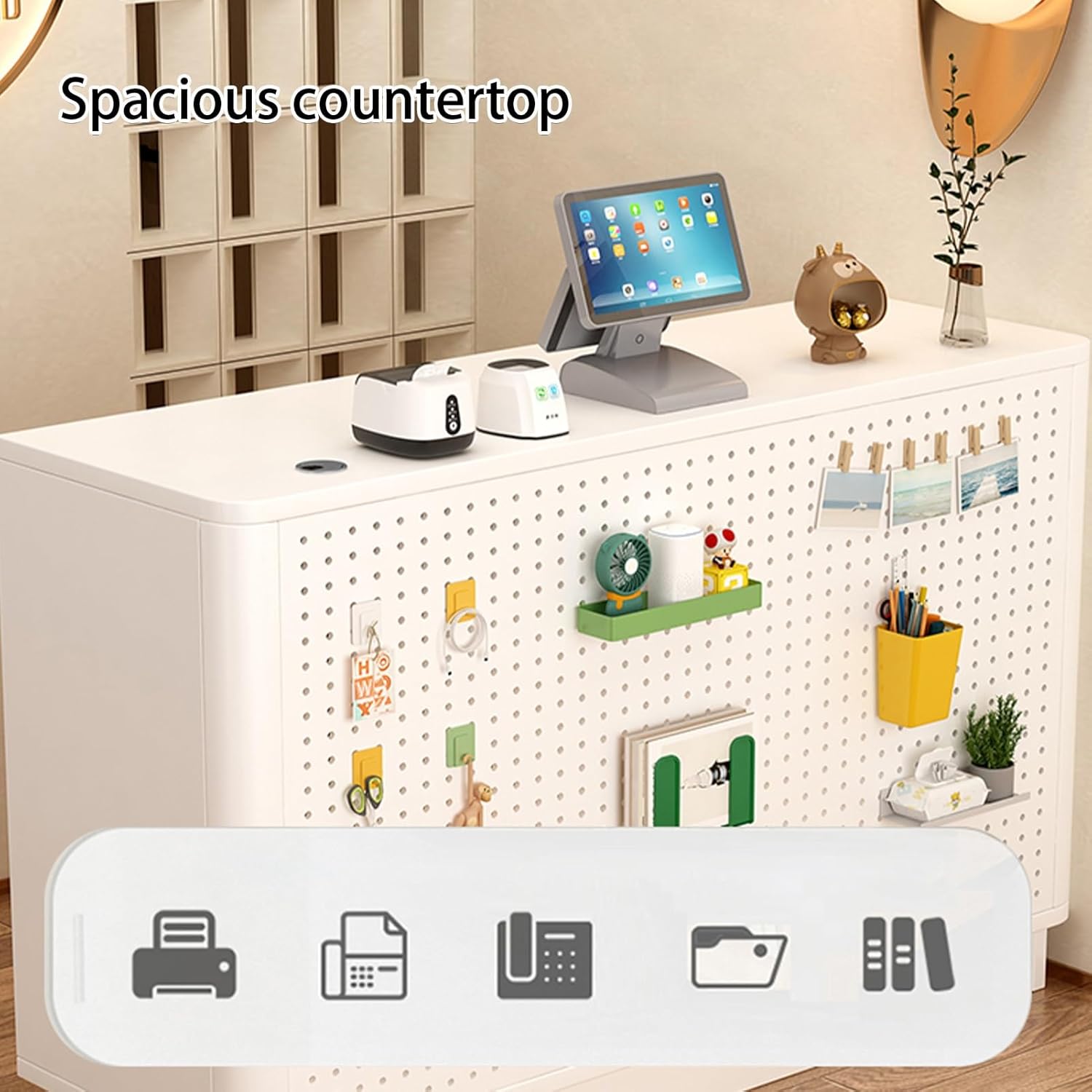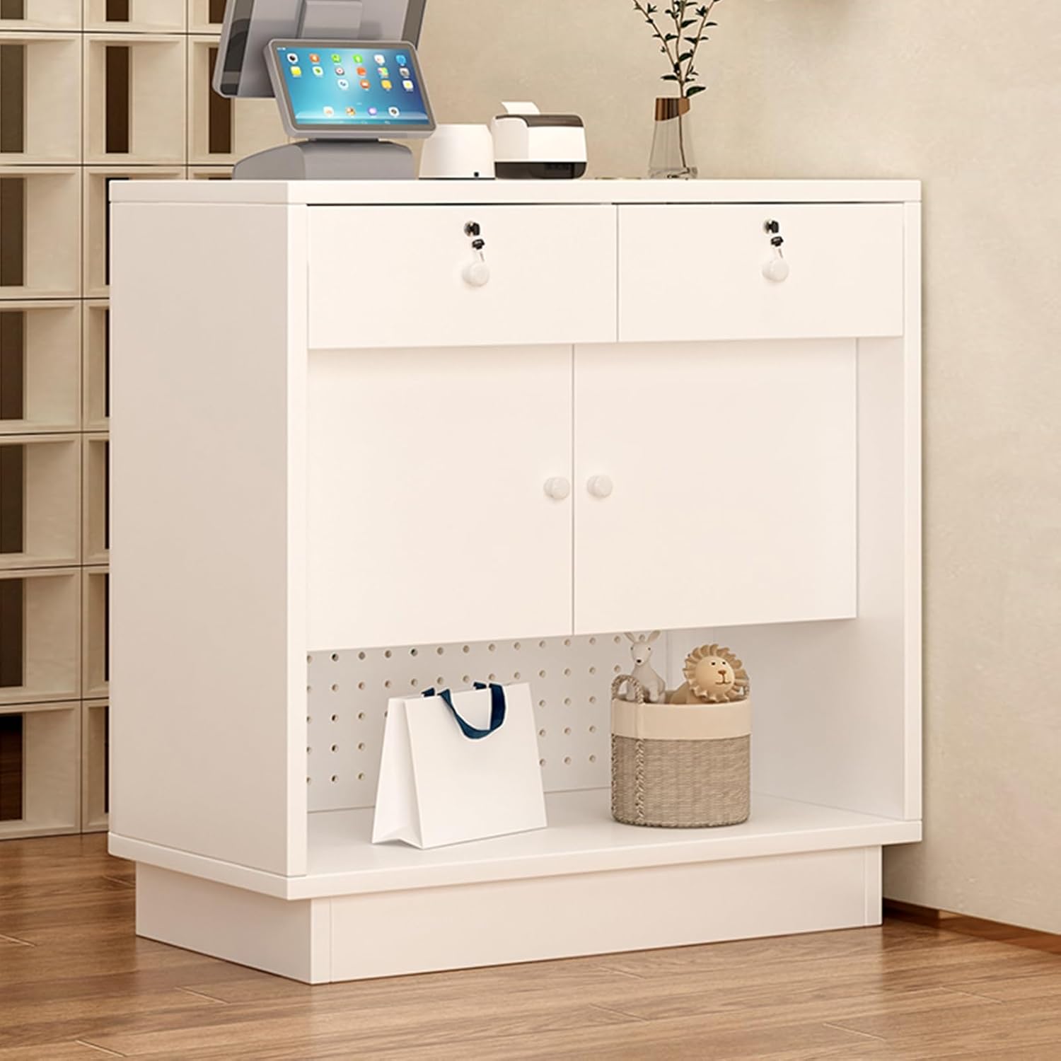 This retail counter comes with a lockable drawer and high side panels, providing a private and secure space for files and essentials, enhancing property security, office reception desk.Stylish and beautiful, this reception desk combines simple and stylish lines and geometric shapes to ignite your passion for life.Product name: Cashier, Reception Desk, Front Desk, Front Counter, Counter Desk, Reception Counter, Retail CounterProduct style: simpleProduct color: multiple colors availableProduct material: Artificial boardApplicable scenarios: clothing stores, beauty salons, etc.Product Size:L: 80cm/31.4inW: 40cm/15.7inH: 88cm/34.6inNotice:1. Note: Due to the particularity of the furniture, there will be slight errors in the finished product, which is normal. The data is for reference only and must be based on the actual product. We hope for your understanding!