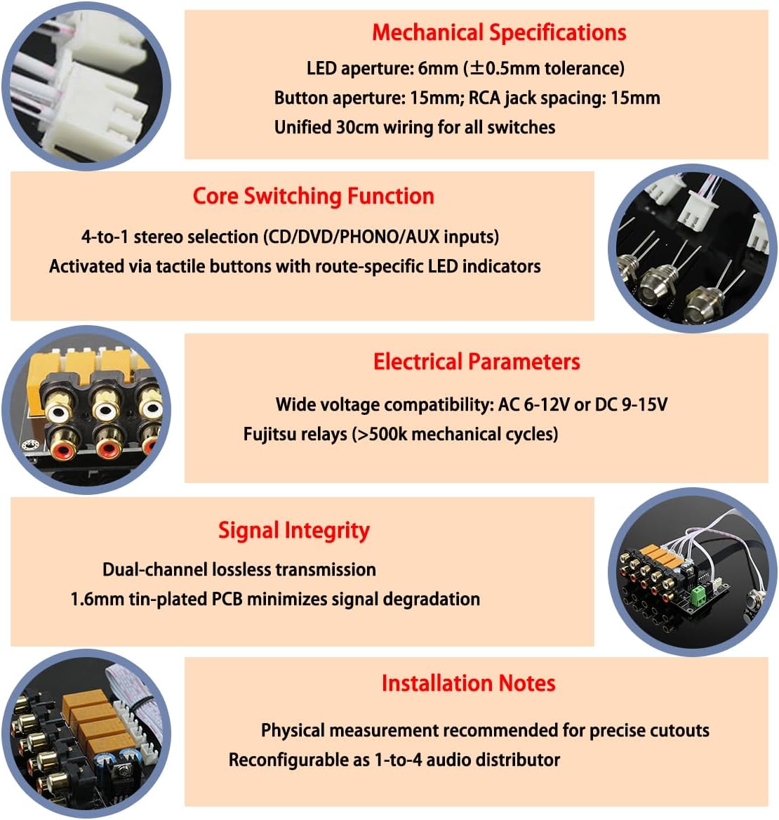 Terminal-Connected Audio Source Switching Board with Huike Relay and 4-to-1 Touch Button Selector for DC/AC Dual Input