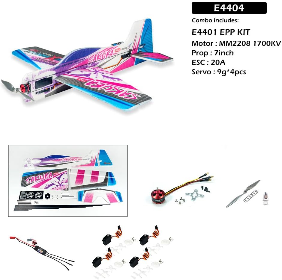 Wingspan: 600mm (24"); Fuselage Length: 650mm(25") Flying weight: 270g; E4401=E44 600mm Sakura Plus KIT E4404=E44 600mm Sakura Plus KIT+MM2208 1700KV+7inch+20A ESC+9g servo w/silver gear*4pcs E4404-L10=E44 600mm Sakura Plus KIT+MM2208 1700KV+7inch+20A ESC+9g servo w/silver gear*4pcs+Transmitter: HOT RC HT-8A (left throttle)+Receiver: HOT RC F08A 8CH E4404-R10=E44 600mm Sakura Plus KIT+MM2208 1700KV+7inch+20A ESC+9g servo w/silver gear*4pcs+Transmitter: HOT RC HT-8A (right throttle)+Receiver: HOT RC F08A 8CH