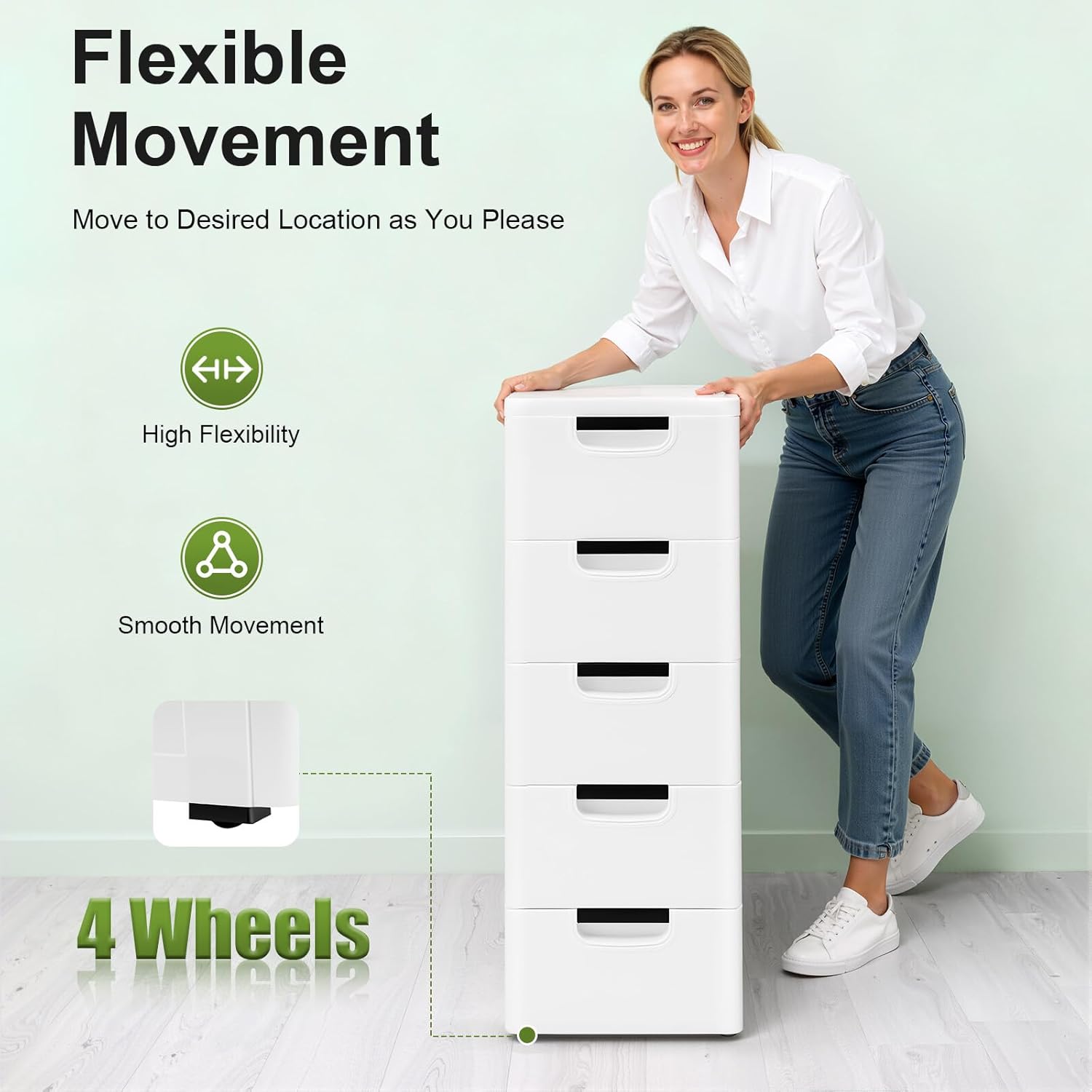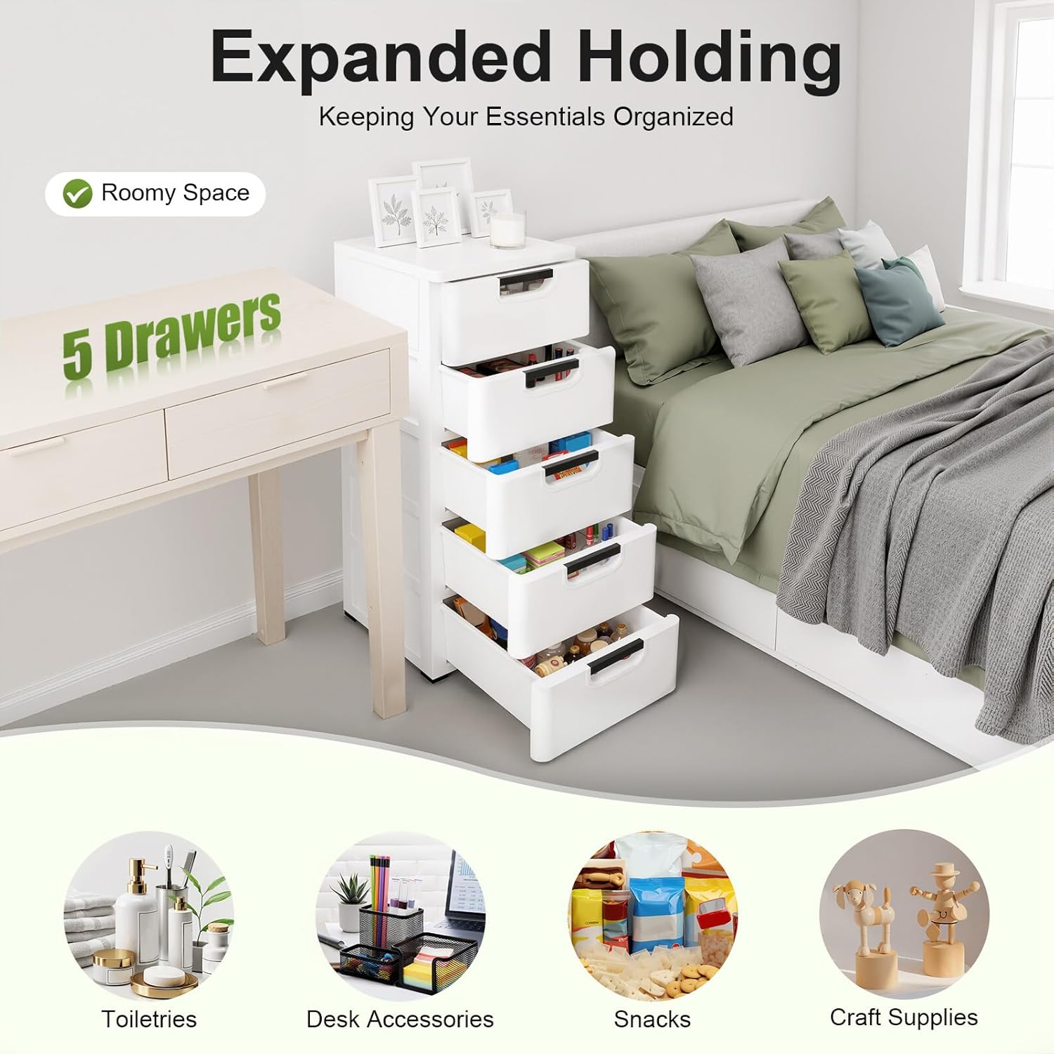 Details Thickened Top Plate: The top plate is thickened to give it a stronger load-bearing capacity. You can place cups, small potted plants, and other miscellaneous items on the top plate.Snaps: The two sides of each drawer are equipped with snaps to prevent the drawer from sliding down.Dense Frame Structure: The 5-drawer storage cabinet is designed with a dense frame, so they are more stable and sturdy.Drawer Handles: The drawers are designed with recessed handles for easy access to items and space-saving. The rounded handles can protect hands from being scratched and is also more beautiful.Smooth Wheels: The wheels at the bottom are made of high-quality PP, which is smooth and delicate. The smooth wheels run with little noise, providing you with a quiet experience. ApplicationThis 5-drawer storage cabinet is suitable for storing clothes, toys, children's books, and other items. The small size makes it suitable for placing in the crevice space next to beds, closets, sofas, and cabinets.SpecificationMaterial: PPStyle: ModernNumber of Layers: 5Color: WhiteNet Weight: 4.1kg/9.03lbsGross Weight: 4.96kg/10.93lbsPackage Size: 41.5*38*31cm/16.33*14.96*12.20inProduct Size: 40*30*84cm/15.75*11.81*33.07inPackage Included16*Panels10*Snaps5*Drawers5*Drawer Panels4*Wheel Racks4*Wheels1*Chinese Manual