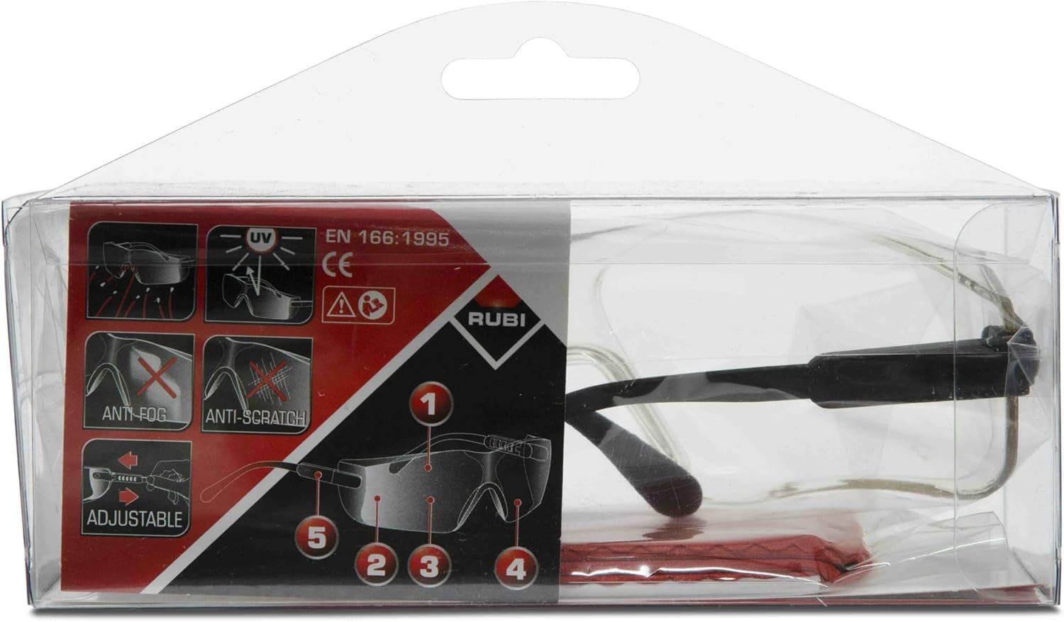 RUBI protective goggles feature a comfortable and lightweight rimless design. The temples are extendable in length and adjustable vertically, for a perfect fit to each user's own physiognomy. The visor, made of polycarbonate, has an anti-scratch and anti-fogging treatment and provides superior lateral and superior protection and mechanical resistance against the impact of particles at high speed and low energy. RUBI protective goggles have a UV-400 protection filter (can alter color perception). RUBI goggles are manufactured in accordance with EN 166 and EN 170 standards. The RUBI brand is known for its high durability and the quality of its tools. For more than 65 years, RUBI has only manufactured products of high durability and strength, to be able to give the best performance to the toughest working conditions and adapting to the demands of each market. RUBI is committed to quality. All our products and tools are subjected to rigorous quality examinations by experienced professionals. We want all the products we have on the market to be recognized for their quality and durability. This desire has made our brand one of the most valued when it comes to providing quality solutions to the professional of ceramic tile laying and construction. At RUBI we have always been concerned about the health of the professional. The concept of ergonomics is always very present within the design of our tools, as we believe that safety and minimizing the risks of injury at work are essential for health and proper execution. At RUBI we not only care about designing, manufacturing and distributing the best tools for cutting and laying ceramic tiles. We also think about the accessories and accessories that every professional ceramic tile fixer may need.