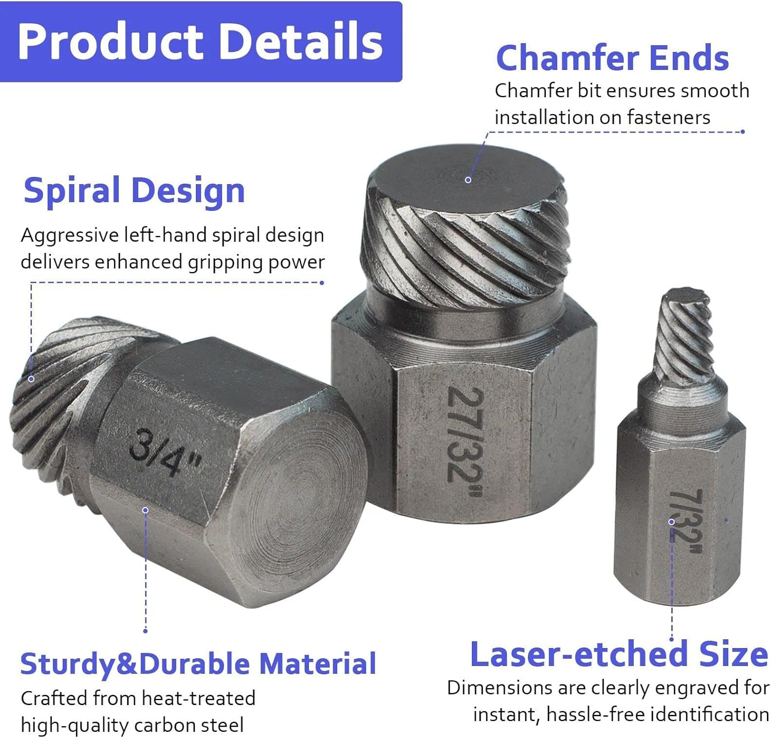 Screw extractor kit is a reliable tool for removing broken or damaged screws from a piece of work without damaging the thread. The size of this easy out screw removal kit is derived from the corresponding screw and bolt size. With this 25 in 1 stripped screw extractor kit at hand, you can easily handle various damaged screw removal tasks. Step-By-Step Usage Guide 1. Check screw size: Measure the diameter of the damaged screw to determine the proper extractor size.2. Drill pilot hole: If the screw is broken below the surface, drill a pilot hole in the center of the broken screw to fit the extractor tip. 3. Insert screw extractor: Insert the extractor and make it seated STRAIGHT and FIRMLY. 4. Drive Extractor: Use a ratchet or wrench to turn the extractor counterclockwise. When you turn, the extractor begins to bite into the screw and pull it out. It might take a little bit of strength, BUT BE CAREFUL NOT TO OVERDO IT TO BREAK THE SCREW EXTRACTOR. Keep turning the extractor until the screw is completely removed. Finally, a pair of pliers is needed to pull the screw out of the drilled hole. Specifications Material: carbon steel + plastic Color: dark grayExtractor Size: 1"-7/8", 1"-27/32", 1"-13/16", 7/8"-25/32", 7/8"-3/4", 7/8"-23/32", 7/8"-11/16", 7/8"-21/32", 3/4"-5/8", 3/4"-19/32", 3/4"-9/16", 3/4"-17/32", 5/8"-1/2", 5/8"-15/32", 5/8"-7/16", 1/2"-13/32", 1/2"-3/8", 1/2"-11/32", 1/2"-5/16", 1/2"-9/32", 1/2"-1/4", 1/2"-7/32", 1/2"-3/16", 1/2"-5/32", 1/2"-1/8" Package Included 25Pcs x screw extractor 1 x plastic case