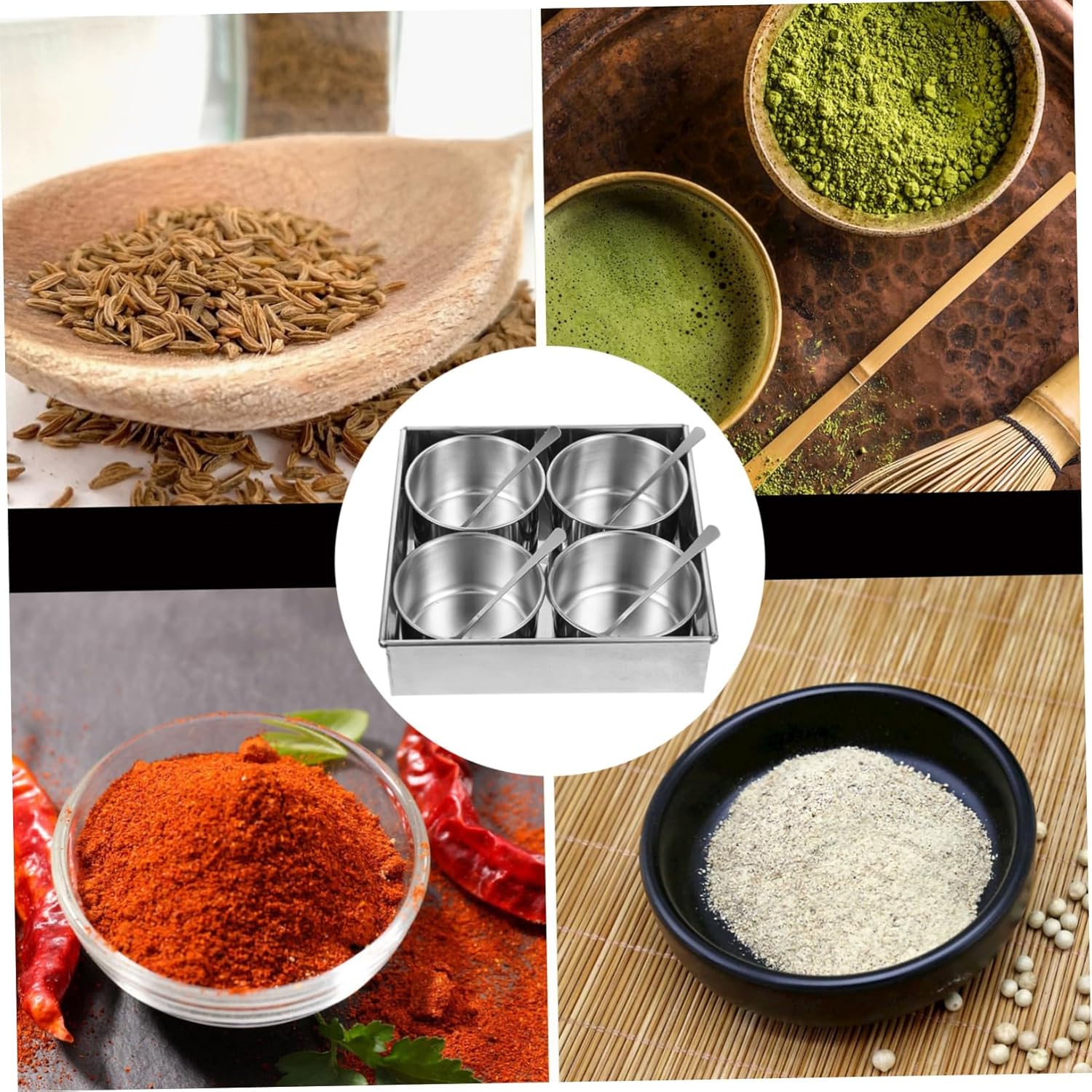 Package List 1 x tray with lid 4 x spice jar 4 x spoons Features -Material:201 stainless steel kitchen spice box -Size:10.00X10.00X5.50cm/3.93X3.93X2.16in condiment container -Size:22.00X22.00X6.00cm/8.65X8.65X2.36in square condiment case -Color:Silver containers with lids -Made from stainless steel, this container that your seasonings stay fresh for seasoning jar. -Suitable for storage of various seasonings, making delicious food simpler and more convenient for cooking. condiment case with lids -This seasoning box is an ideal anyone who enjoys cooking or hosting gatherings, very convenient seasoning container. -The sleek and modern design of this seasoning container makes it a addition to any kitchen decor stainless steel pot. -This spice jar is widely-used, suitable for kitchen, restaurant and other places, convenient cooking and seasoning household condiment storage pot.Goods Informationkitchen condiment container daily use and special occasions.kitchen condiment jar This is a seasoning jar, made of stainless steel materials for to use.stainless steel storage jar You can use it to store condiments, spices, etc by the large capacity to fit your needs.kitchen seasoning jar With its simple design, it is very and portable, easy to clean