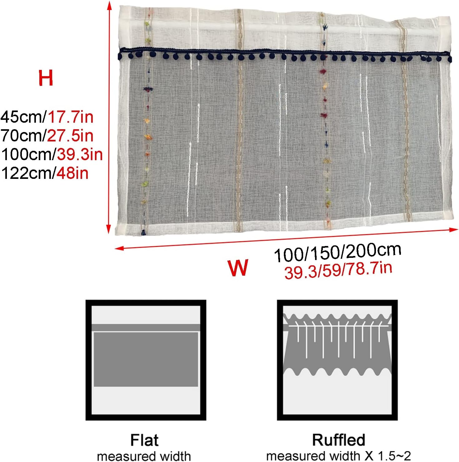 ♦ The style is fashionable and simple and beautiful, romantic and fresh, beautiful texture weaving and high-quality craftsmanship, make your room look attractive.♦ Curtains can determine light transmission through the strength of the pleats, which also provide good personal protection.♦ Rod pocket curtains make it easier for you to install on the curtain rod. Fits most standard or decorative curtain rods.♦ This short curtain fits in perfectly with your home decor style, and the little ball fringe on top is a fun addition.♦ Specifications▸ Product Name: Country style half curtain▸ Material: Cotton▸ color: White▸ Decoration: color bars and blue balls▸ Size: WidthxHeight. Size can be customized, please contact us if you need to customize▸ Use place: Cabinet, small window, cupboard, interior door.▸ The package includes: 1 short curtain (not including the rod)♦ Care instructions Hand wash gently in warm water, do not bleach. Do not scratch the curtains with sharp objects.♦ Notes on size selection▸ For the whole large window, 2 panels would be prettier.▸ All curtain sizes are measured after tiling, without folds.▸ Please measure the window size carefully before purchasing.♦ Friendly reminder▸ The size is measured by hand, there may be 1-3 cm error.▸ Due to the condition of the monitor, the color of the picture and the actual product may differ. Please understand this beforehand.