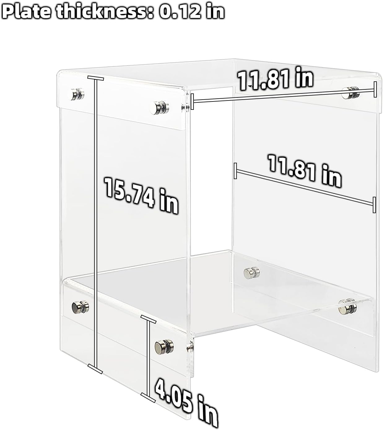 Introducing LUOBAO Acrylic End Table, the perfect addition to any modern living space. Size 11.81" L x 11.81" W x 15.74" H Whether you need a spot to place your favorite book, a cup of coffee, or a decorative item, this table has got you covered. Its transparent design allows it to seamlessly blend into any existing decor, making it an ideal choice for small apartments or rooms with limited space. The sturdy construction of this end table ensures durability and longevity. The acrylic material used is not only lightweight but also resistant to scratches and breakage, making it a reliable option for everyday use. Rest assured, this table will withstand the test of time and maintain its pristine appearance. In addition to its practicality and durability, this end table also offers portability. Use it as a bedside table, a side table in your living room, or even as a display stand for your favorite plants or photographs. Upgrade your living space with our Acrylic End Table, a perfect blend of functionality, style, and durability. Add a touch of modern elegance to your home and enjoy the convenience of having a versatile and reliable piece of furniture at your fingertips. Order now and experience the difference this end table can make in your daily life.