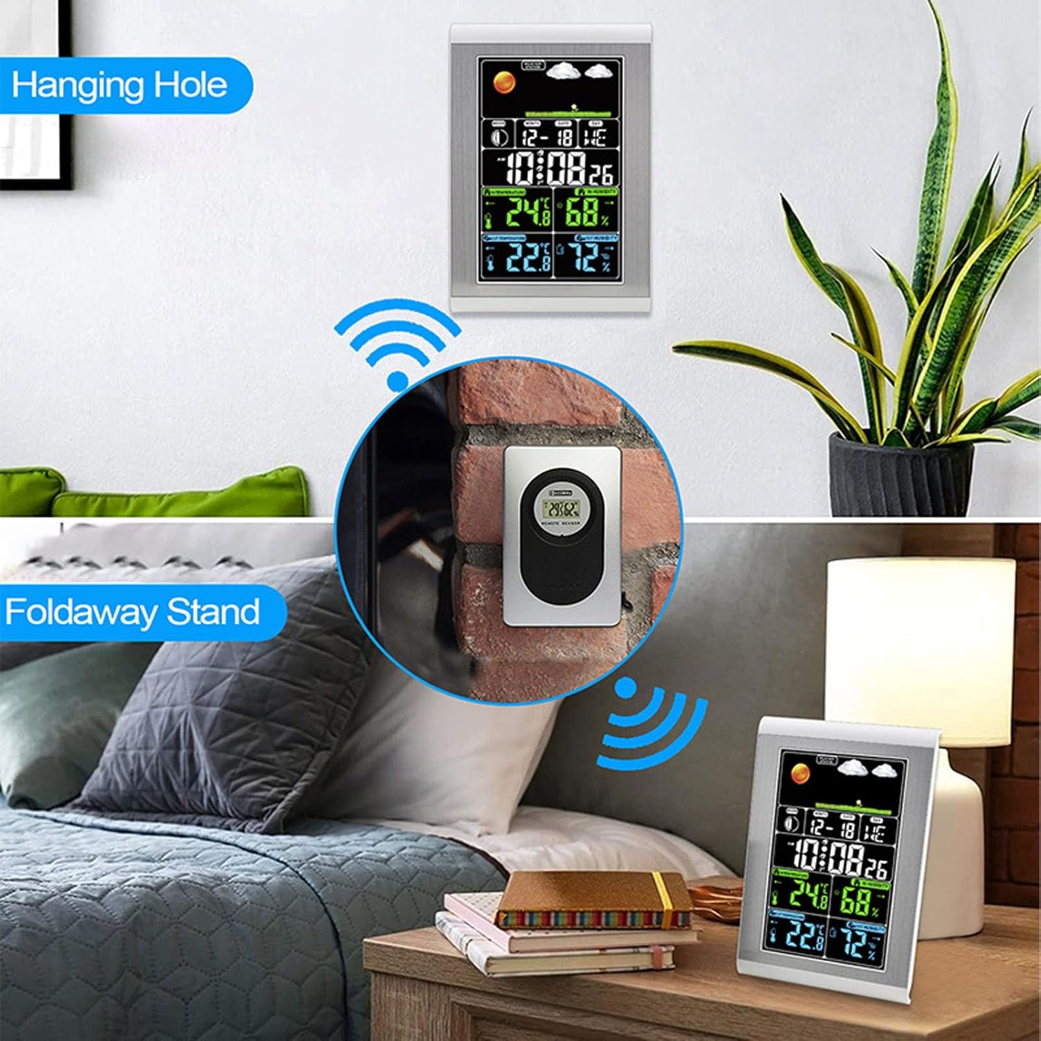 1. MULTIPLE FUNCTIONS: Weather clock come with six function buttons, MODE, UP, DOWN, CH, MAXIMUM or MIN, SNOOZE or LIGHT, flexible and adjustable 2. WEATHER FORECAST FUNCTION: The weather clock can predict the weather conditions in the next 24 hours, the weather level is divided into sunny, cloudy, overcast, rainy, snowy 3. FLEXIBLE AND OPTIONAL: The wall weather clock can be selected with or without radio waving function, and the radio waving system is divided into (Germany), WWVB (USA), MSF(UK), no radio waving function 4. INDOOR OUTDOOR TEMPERATURE HUMIDITY DISPLAY: Make the current indoor and outdoor temperature and humidity at a glance through the easy to read full color display. Built in indoor temperature and humidity sensors, outdoor smart sensors (included) to transmit outdoor temperature and humidity. The smart sensor can be placed anywhere within 100 feet of the receiving unit. The sensor require 2 AAA batteries(not included) 5. FOLLOW TEMPERATURE: The temperature humidity clock tracks and displays temperature and humidity trends so you know how the current weather is reacting in your location. Easy to read icons show whether the temperature is rising, constant, or falling. Temperature and humidity trends are updated every 15 minutes with a review of the previous hour Specification: Item Type: Weather Clock Material: ABS Use: Weather clock Main Unit Battery: 3 x AAA batteries(not included) Sensor Battery: 2 x AAA batteries(not included) Weight: Approx. 366.00g / 12.91oz How to Use: Install the batteries and the product is ready to use. packing list: 1 x Main Unit 1 x Sensor 1 x USB Cable 1 x Stand