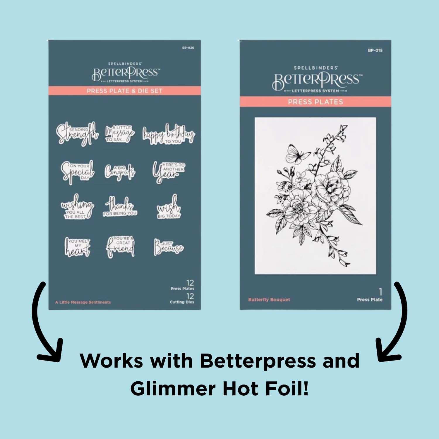 The Spellbinders Glimmer Hot Foil System Starter Bundle includes not only the machine but various accessories to get you started on your hot foil journey. A 4-pack variety of metallic hot foil rolls, the Glimmer specialty cardstock, and two Press and Foil plates. With the Glimmer Hot Foil System , you can add stunning and eye-catching foil details to any card or mixed media project. This exciting new system was designed to be used with your Platinum or Platinum 6 Die cutting & embossing machine and is also compatible with many other die cutting machines including the Big Shot, Vagabond and many others. The Glimmer Hot Foil System is easy to use. Just heat the platform & chosen plate, create your foiling sandwich, and then run the platform through your die cutting machine. Foiled elements can be added to various materials, such as cardstock, fabric, ribbon, leather, and more. You can even create foiled designs using some of your existing metal dies. Create beautiful, foiled cards and mixed media with the use of this bundle – a $237 Value! Includes: GLS-005 Glimmer Hot Foil System: Hot foil machine Power cord Heat Resistant Acrylic Shim Thin Heat Resistant Shims Silicone Cooling Pad Magnetic Pick-Up Tool Gold and Rainbow Foil Rolls Exclusive Hot Foil Plate Glimmer Hot Foil Rolls – Essential Metallics 4pk Each roll is 15-foot with a width of 5-inches. Colors include Satin Pewter, Satin Gold, Satin Rose Gold, and Satin Champagne. Glimmer Specialty Cardstock 8.5 x 11” - 10pk BP-015 Butterfly Bouquet Press & Foil Plate BP-026 A Little Message Sentiments Press & Foil Plate + Die