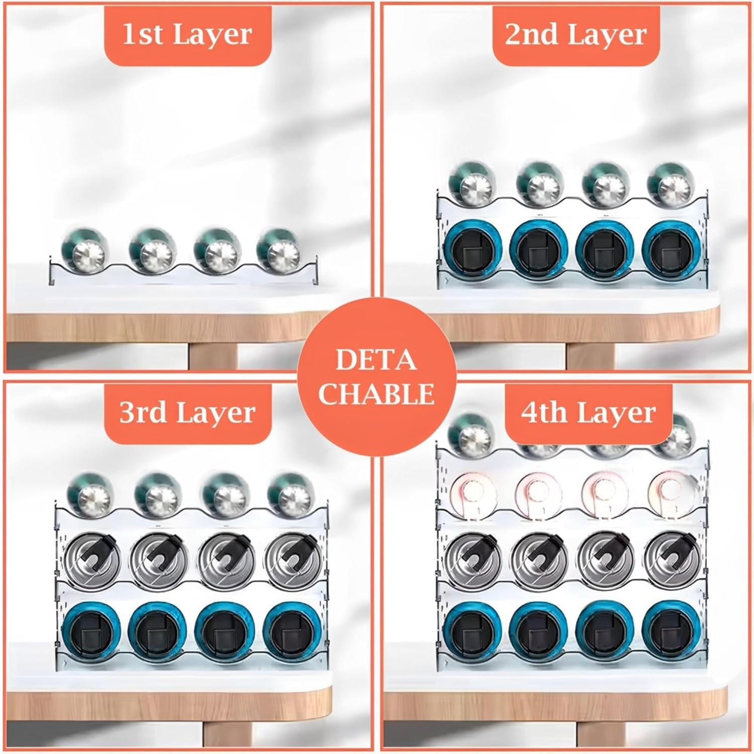 • 4-Tier Stackable and Modular Design: This Water Bottle Organizer offers flexible, space-saving storage for up to 16 bottles, tumblers, or mugs in a vertical arrangement. Water Bottle Storage modular system allows you to easily customize stacking to fit different cabinet, pantry, or fridge heights, optimizing organization while keeping bottles accessible and visible in a compact, clutter-free format.