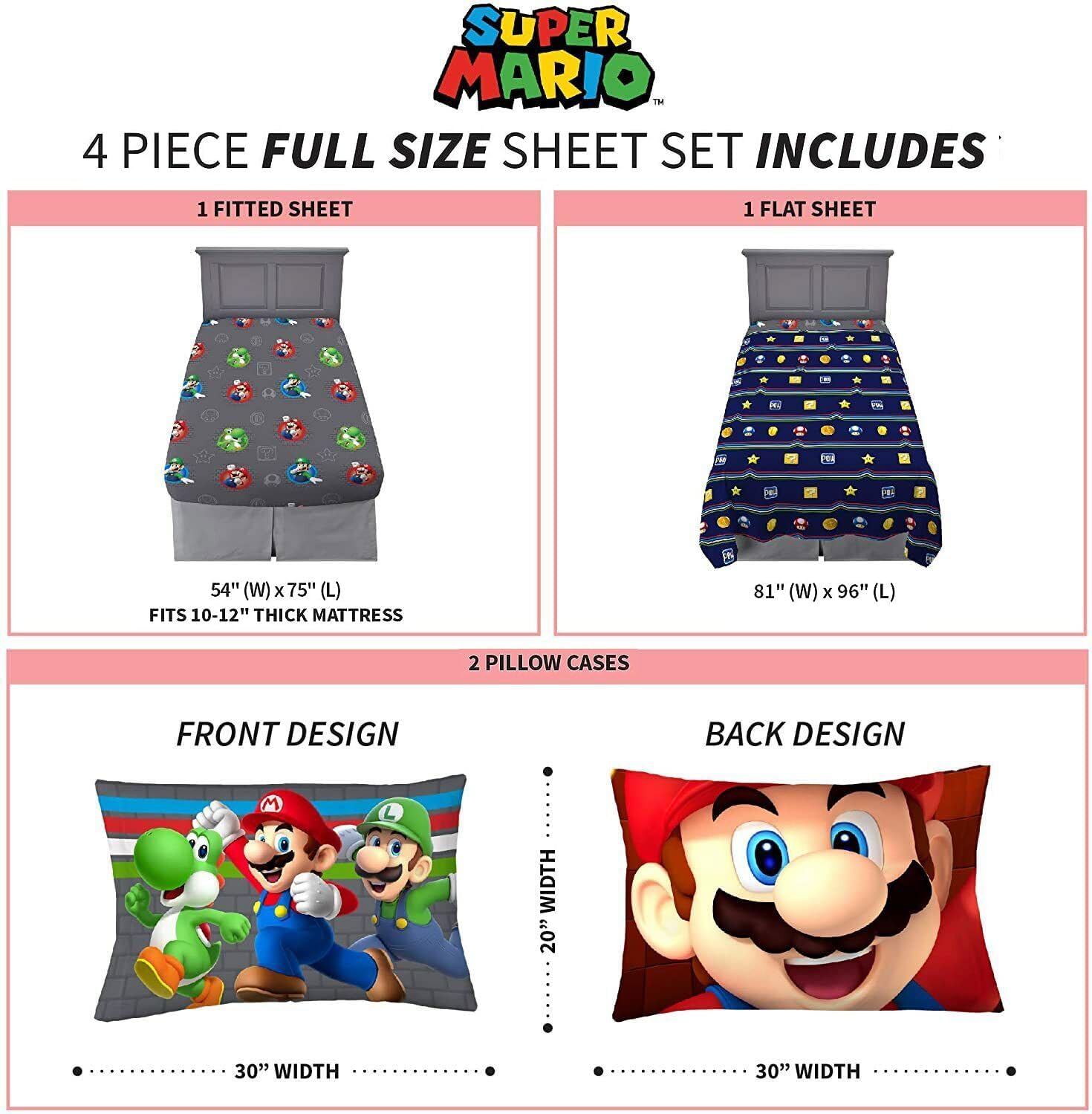 Bring the excitement of Franco Kids Bedding Super Mario to bedtime with this cool and colorful FULL SIZE sheet set. The vibrant flat and fitted sheets both feature all over print of characters from super Mario world while the pillowcases showcase Mario, Luigi and Yoshi. WIth Vibrant colors and a fun design, this sheet set is the perfect addition to the bedroom of any young gamer in your life. The vibrant and versatile set features bold colors and action-packed imagery of Super Mario, Luigi and Yoshi from the hit Nintendo videogame. This high-quality microfiber full size sheet set includes a fitted sheet, flat sheet, and 2 pillowcases. The cozy flat sheet, top sheet and 2 pillowcases add to the look with coordinating character artwork in complementary bright colors. Instantly recognizable, Super Mario, Luigi and Yoshi have been synonymous with Nintendo for decades. Help inspire a new generation of Super Mario fans by bringing the action home with this stylish, high-quality full size sheet set. Fits a full size bed. Comforter not included.