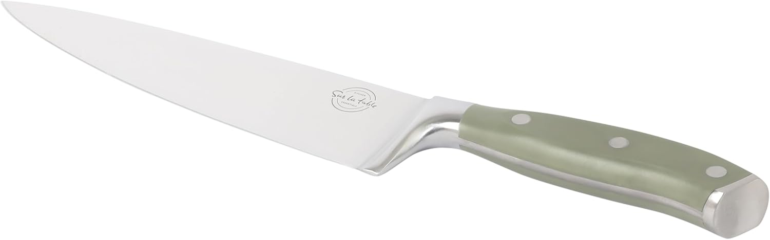 Equip your kitchen with trustworthy tools that take the guesswork out of everyday food prep. Razor-sharp knives from the Tasting Kitchen Collection offers an effortless approach to any kitchen cutting task for precision portioning and joy-filled eating. Favored by home and professional cooks, German steel offers maximum strength and resistance to rust and corrosion. Each rust-resistant blade is forged from a single piece of German steel to provide the ideal weight and balance for better control when slicing, dicing, and mincing. Stainless steel rivets secure the vibrant-colored ABS handle for a strong and confident grip. When not in use, the ashwood knife block stores and displays the knives in an elegant fashion, keeping them organized, accessible and ready for your next culinary challenge. Hand wash only. Sur La Table Kitchen Essentials is your cooking toolkit for preparing crowd-pleasing homemade dishes and desserts. Invite discovery and delight to in-home dining with practical, modern cookware, dinnerware, and must-have utensils for carrying out every kitchen task. So, roll up your sleeves, cook delicious food and make people happy.