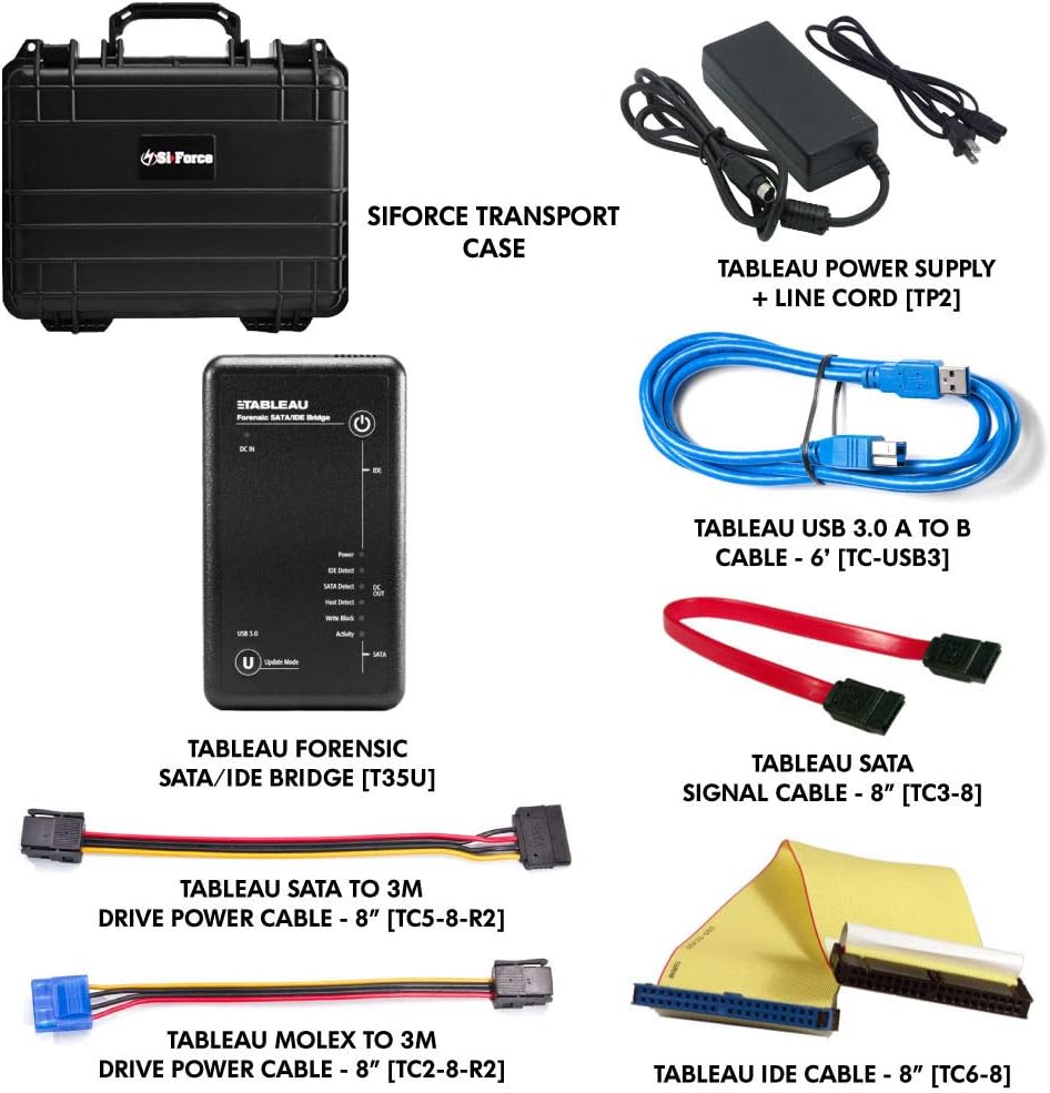 • Tableau TK35U+ Kit includes: T35u Tableau Forensic SATA/IDE Bridge, TP7 Power Supply + Line Cord, TC2-8-R2 Tableau Molex to 3M Drive Power Cable, TC3-8 Tableau SATA Signal Cable, TC5-8-R2 Tableau SATA to 3M Drive Power Cable, TC6-8 Tableau IDE Cable, TC-USB3 Tableau USB 3.0 A to B Cable, T35u Quick Reference Guide, SiForce Rugged Case.