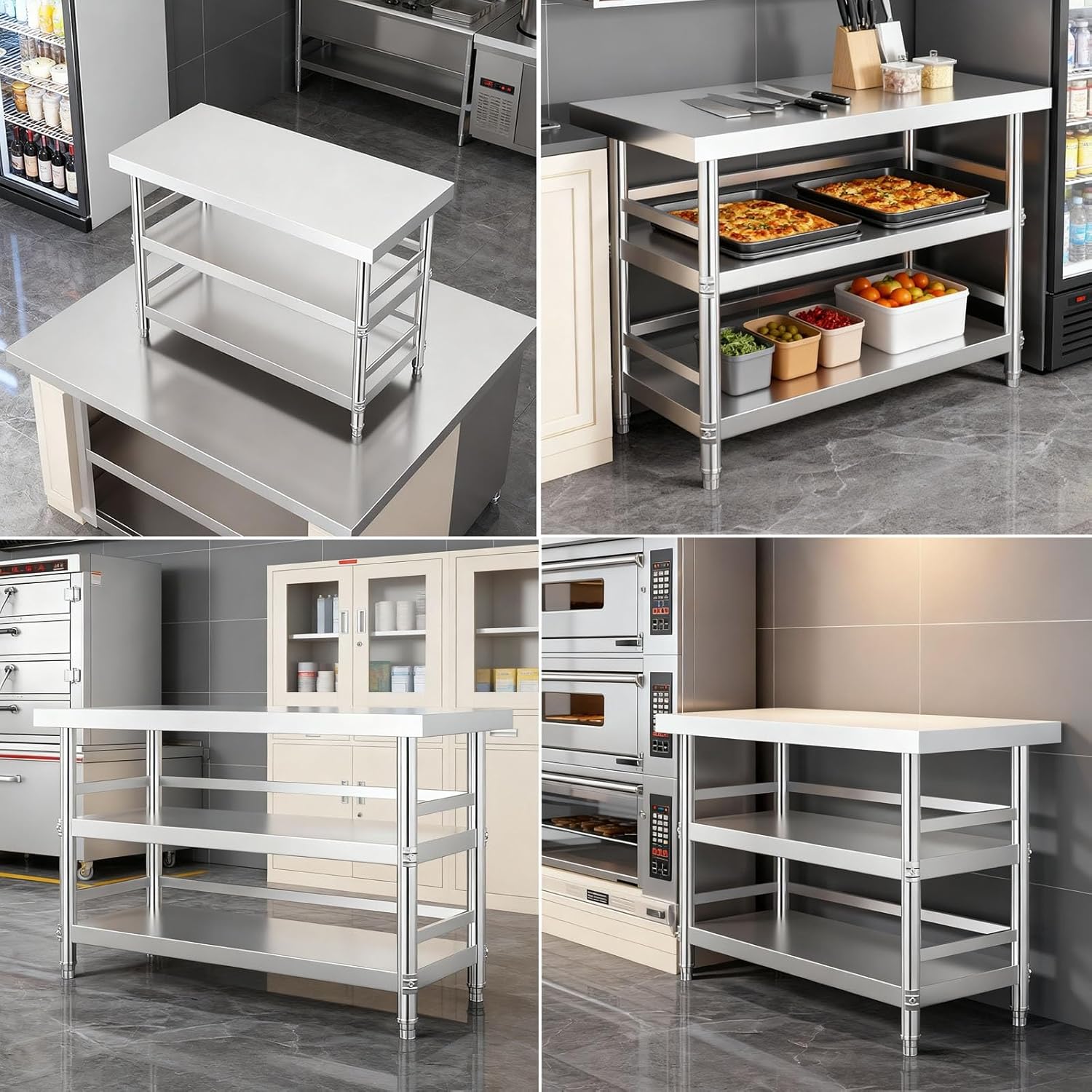 Stainless steel work countertop with reinforced bottom supportTiered shelf design for vertical storageNeat organization with integrated work and storage spaceLeveling feet with height adjustmentScrew-adjustable height feet for uneven surfacesProduct Name: Stainless Steel Railing WorkbenchProduct Craftsmanship: Brushed Stainless SteelProduct Style: Product StyleDimensions:60x40x80cm/23.6x15.4x31.5”, 70x40x80cm/27.6x15.7x31.5”, 80x40x80cm/31.5x15.7x31.5”, 90x40x80cm/35.4x15.7x31.5”, 100x40x80cm/39.4x15.7x31.5”, 120x40x80cm/43.3x15.7x31.5”, 60x50x80cm/23.6x19.7x31.5”, 70x50x80cm/27.6x19.7x31.5”, 80x50x80cm/31.5x19.7x31.5”, 90x50x80cm/35.4x19.7x31.5”, 100x50x80cm/39.4x19.7x31.5”, 120x50x80cm/47.2x19.7x31.5”, 60x60x80cm/23.6x23.6x31.5”, 80x60x80cm/31.5x23.6x31.5”, 90x60x80cm/35.4x23.6x31.5”, 100x60x80cm/39.4x23.6x31.5”, 110x60x80cm/43.3x23.6x31.5”, 120x60x80cm/47.2x23.6x31.5”, 80x80x80cm/31.5x31.5x31.5”, 90x80x80cm/35.4x31.5x31.5”, 100x80x80cm/39.4x31.5x31.5”, 120x80x80cm/47.2x31.5x31.5”Suitable for: Restaurants/Kitchens/WorkspacesProduct List:Workbench x1Important Notes:Stainless steel products may exhibit slight welding marks due to manufacturing processes.Minor scratches may be present on stainless steel components.All dimensions are manually measured and may have slight variations.Images may show slight color differences due to shooting angles and lighting variations.