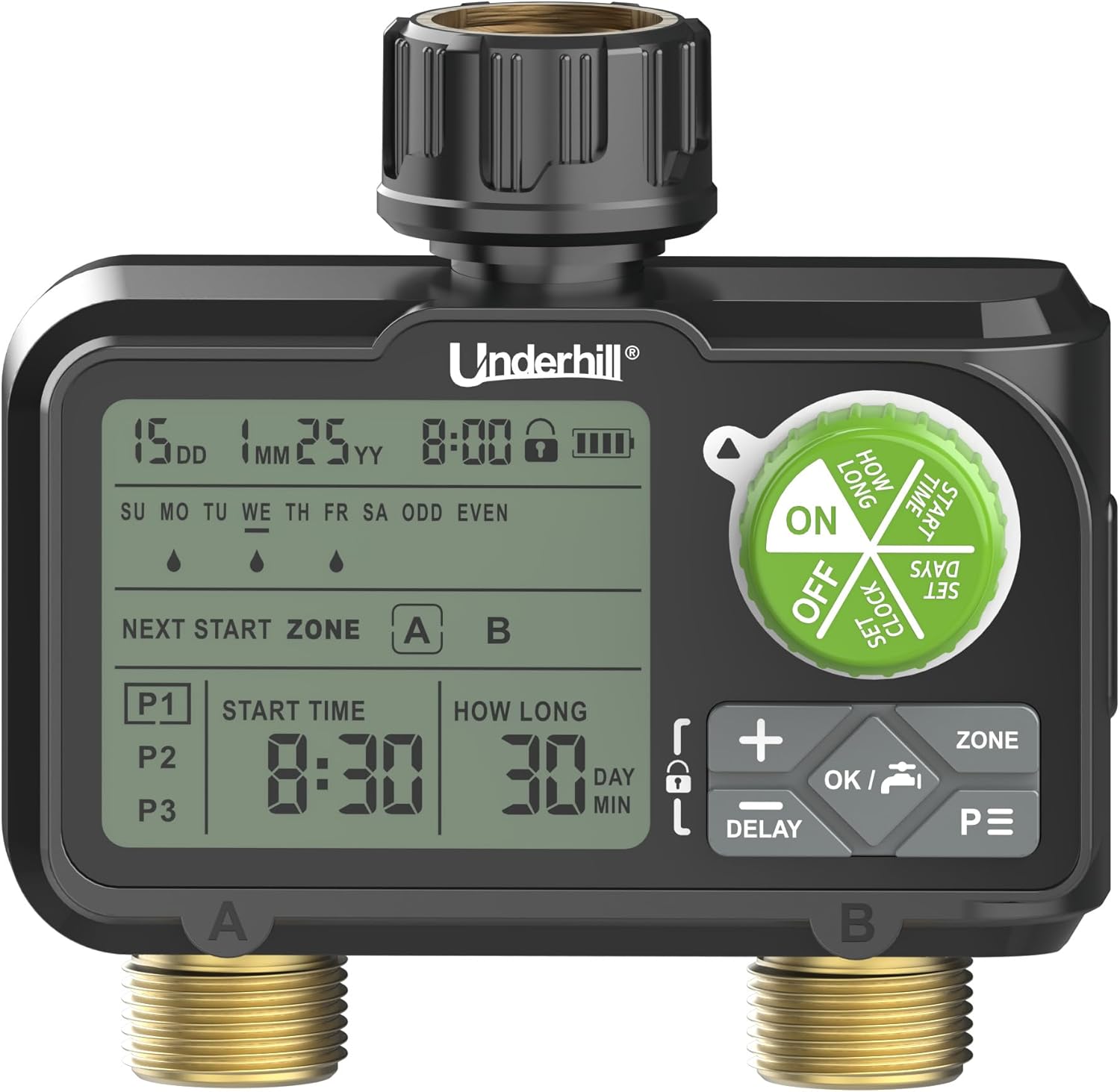 Take the guesswork out of watering with the Underhill AquaVision Digital Hose Timer. Designed for homeowners who want professional-level irrigation control without complicated programming, AquaVision allows you to set customized watering schedules in just minutes. Whether you’re watering lawns, flower beds, shrubs, or a drip irrigation system, this timer delivers consistent, automated results. The large digital display makes programming easy to see and adjust, while the durable outdoor construction ensures long-lasting performance in sun and weather. Perfect for lawns, raised beds, vegetable gardens, drip irrigation systems, vacation watering, water conservation programs, or even livestock or pet watering. Underhill has been trusted by turf professionals and irrigation experts for decades. Now you can Use What the Pros Use right in your own backyard.