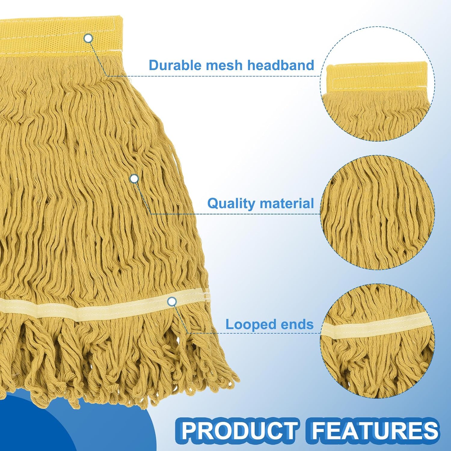 Advantage:[Material] - These compact commercial mop head is designed with encrypted cotton thread, are double-layer thick, have strong water absorption, high water storage rate, and improve floor cleaning performance. Great for dry or wet mop, and bring your convenience. The colors of industrial mop heads are bright and will not fade.[Easy To Use]- These commercial mop heads is easy to install and replace. Just open the latch, slide the mop head into place, then clamp it tightly Both for dry and wet use. You can use it to clean tile, wood, laminate, stone, window, and even cars.[Efficient Cleaning] - Cotton string mop head features a looped end construction, multi-directional cleaning, easily absorbs dust and hair, which can effectively prevent the mop rope from falling and knotting, keeps mop ends from fraying, tail-band reduces tangling and wearing,[Wide Application]-These mop heads for floor cleaning are suitable for all types of surface areas, homes, decks, tile floors, marble floors, hardwood, restaurants, bathrooms, and garages. Great for commercial, industrial, and residential useSpecification:Material: Cotton threadColor: YellowLength: 37cm/14.5inchTop Width:15.5cm/6.1inchBottom Width: 34cm/13.4inPackage Included: 6pcs mop head