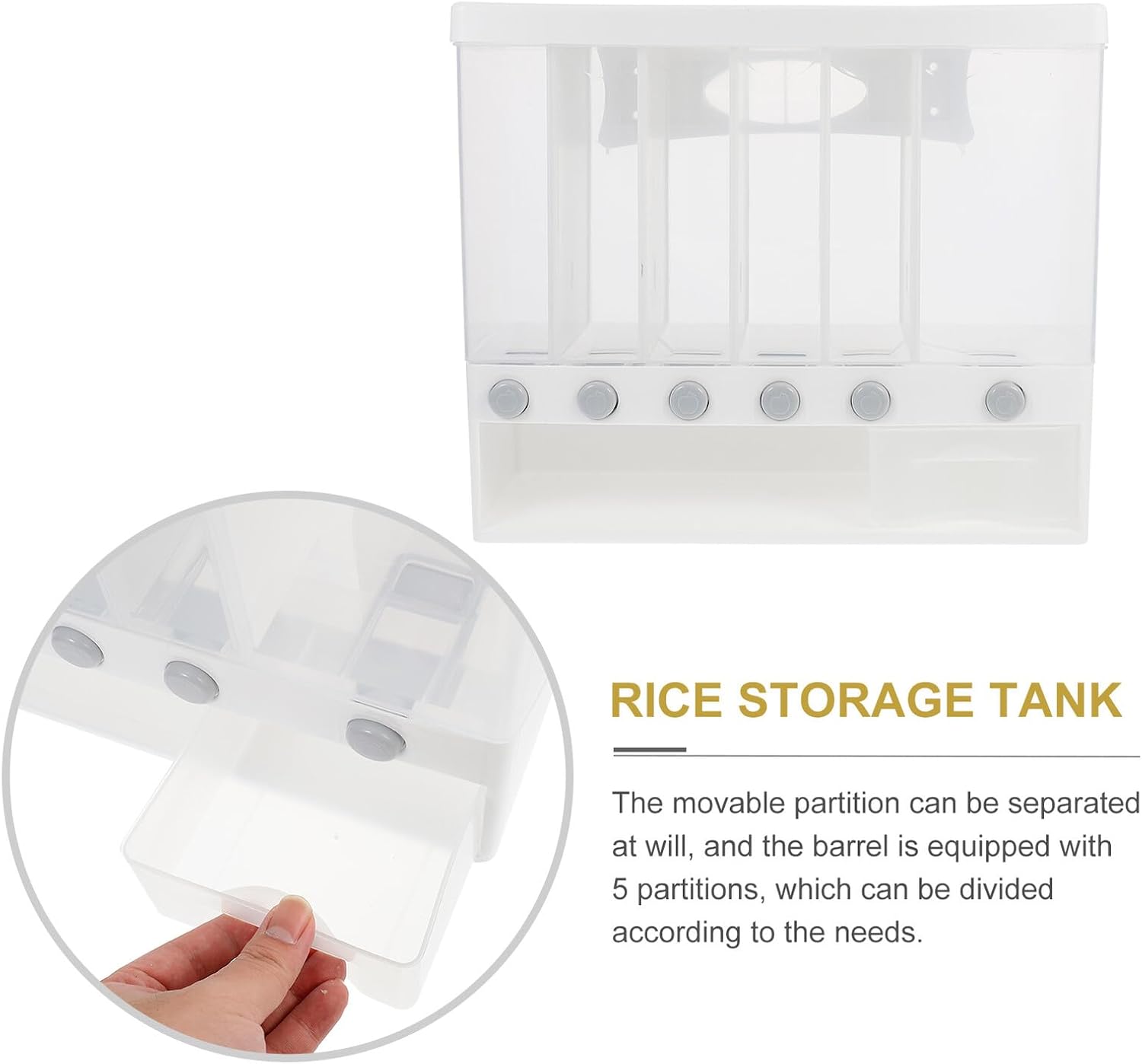 Package Include 1 x Rice Storage Bin Features - Color: White. - Size: Aprpox. 38.00X32.40X14.40cm/14.93X12.73X5.66in. - Material: PP. -Product Info:Rice storage tank - The back hanging buckle can be hung on the wall to save space Pressed Out Rice Dispenser. - Transparent barrel, press to take rice, convenient and practical. Transparent barrel, visual design, easy to check the margin at any time, press to take rice more convenient Moisture- Grain Bin. - Narrow barrel does not take up space, space-saving and convenient, can be put it on the corner of the tabletop Bean Dispenser. - The movable partition can be separated at will, and the barrel is equipped with 5 partitions, which can be divided according to the needs Wall-mounted Rice Container. - Using PP material of and fine craftsmanship, environmentally friendly, moisture- and - .Goods InformationPressed Out Rice Dispenser Are you still worried that rice will easily lose its aroma? Are you still worried about the difficulty of storing dry food in the kitchen? So, you miss our storage container with lid, using PP material of and fine craftsmanship, and