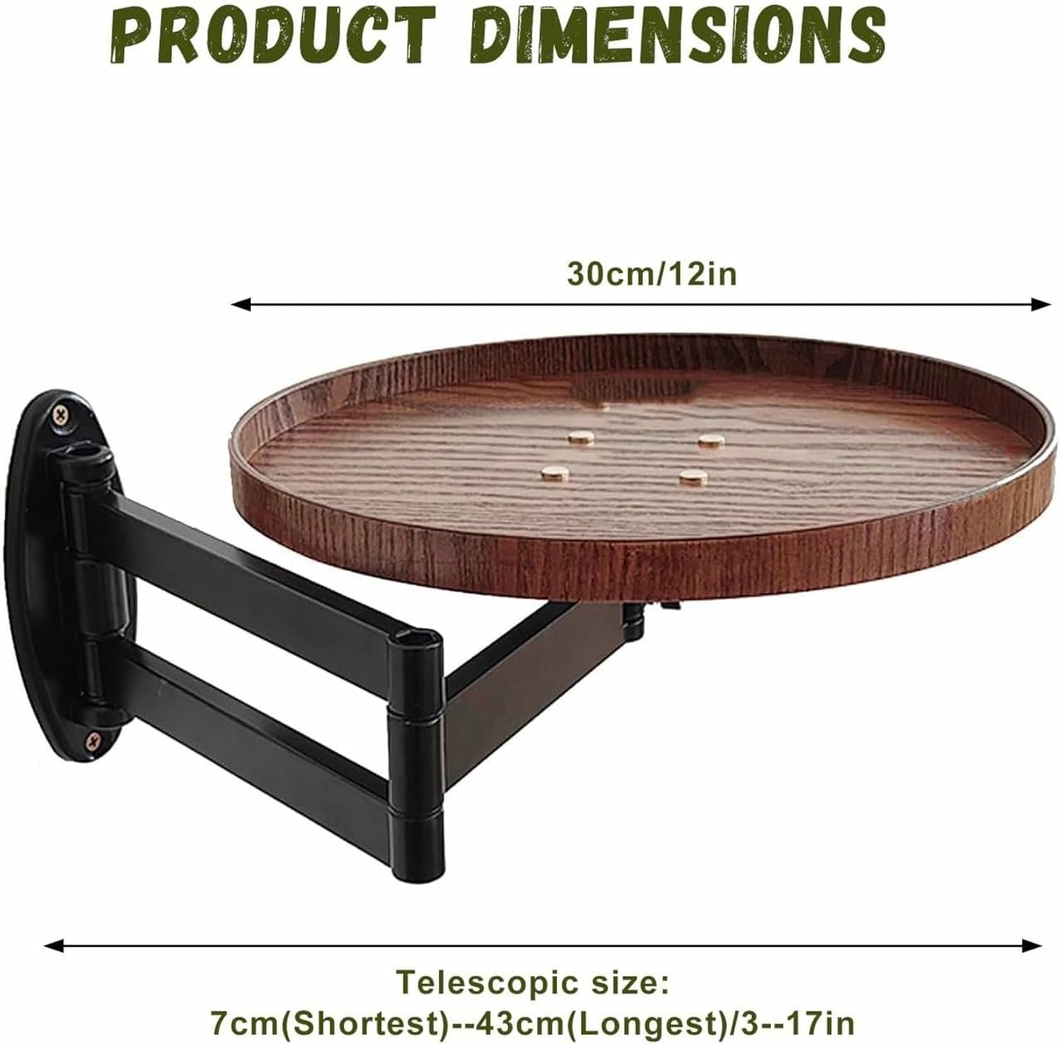 Wall mount hanging dining table parameters:Dimensions:Desktop diameter: 30cm (11.8in).Telescopic length: 7cm-43cm (2.7in-16.9in).Folding thickness: 9cm (3.5in).Material:Table top: solid wood plywood.Stand: metal.Load capacity: recommended maximum 5kg (11lb.).Color: Original wood color (can be adjusted according to the actual product).Installation: drilled mounting with screws included.Summarize:This folding wall mounted table pallet table combines versatility, space-saving and modern design, making it ideal for small families, renters, camping enthusiasts and commercial establishments. Whether as a makeshift dining table, bedside table or decorative display rack expand furniture, it fits perfectly into your daily life and brings you more convenience and comfort!