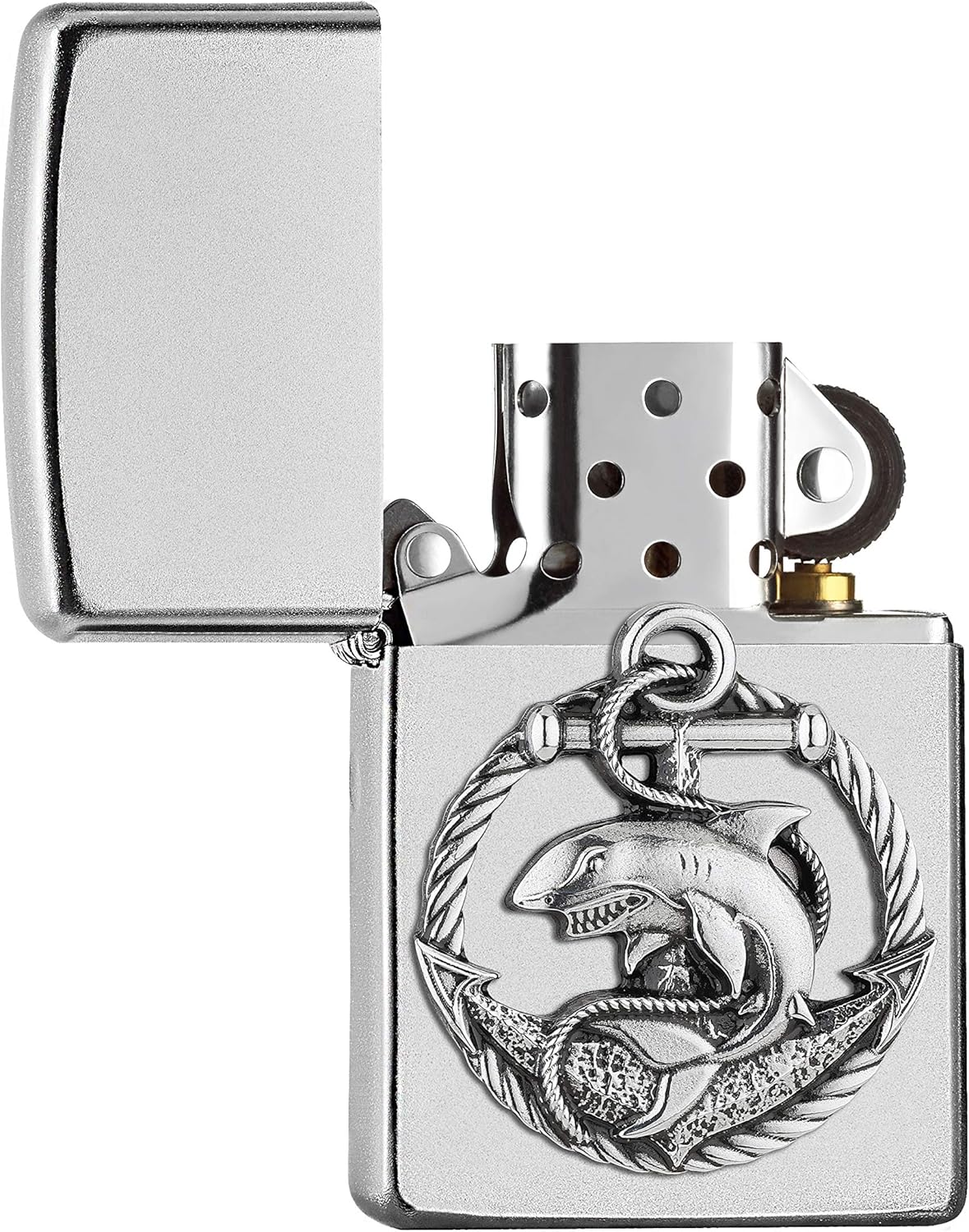 The Zippo with the Emblem is a great gift for the home collection or everyday use. Whether it's for yourself or those around you, the Zippo is ideal for the creative free spirits among us Your Zippo benefits at a glance - Lifetime Warranty - true to the motto: "It works or we'll fix it for free." - Refillable for a lifetime of use - Windproof lighter for fire in any situation - Satin Chrome - Made in the USA What makes this lighter so unique? - the creative Shark design - the Emblem Your Zippo usage recommendation for a lifetime of use - Refill with genuine Zippo premium lighter fuel - Use the genuine Zippo flints - Use the genuine Zippo wicks Another Zippo brand product with the usual high quality, long lasting and incomparable quality.
